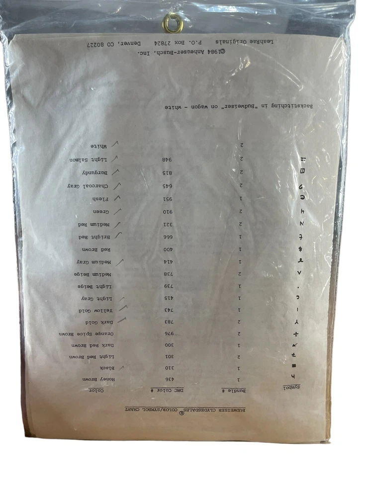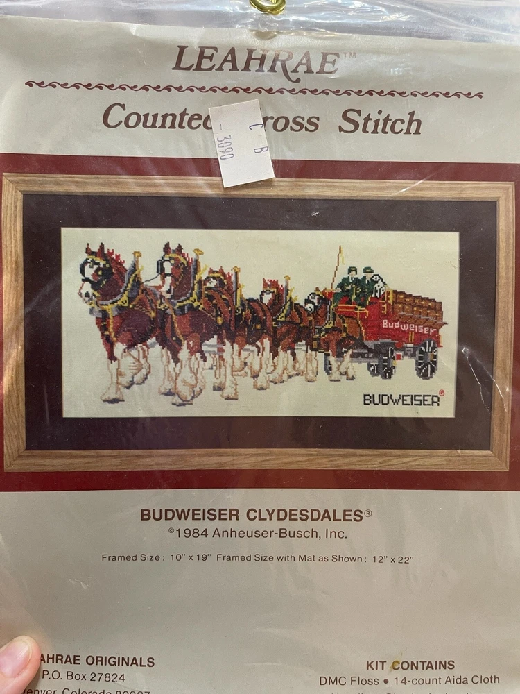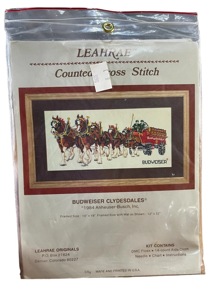 This has been opened and started by previous owner. See pictures. All items appear to be included. This vintage Leahrae cross stitch kit features a charming Budweiser Clydesdales design, perfect for any antique and history enthusiast. The kit includes a framed size with mat, pattern, needle, stitching guide, thread/floss, and everything you need to create a beautiful cross stitch piece. The brand Leahrae is known for their high-quality embroidery kits, and this one is no exception. With a bundle of all the necessary items, you'll have everything you need to get started on your next cross stitch project. The theme of this kit is antiques & history, making it a unique and interesting addition to any collection.