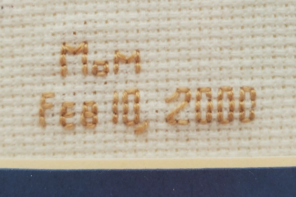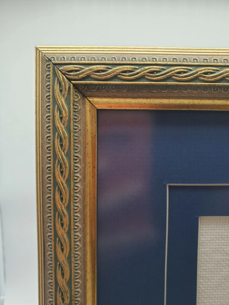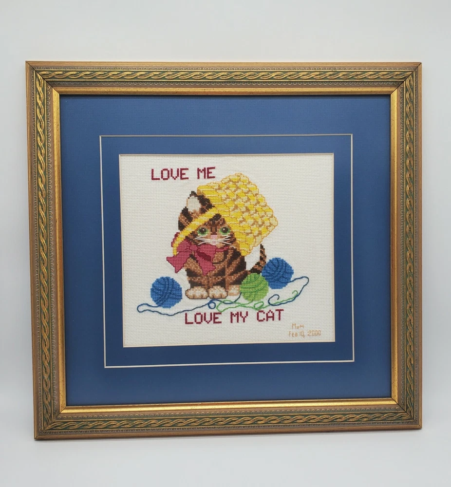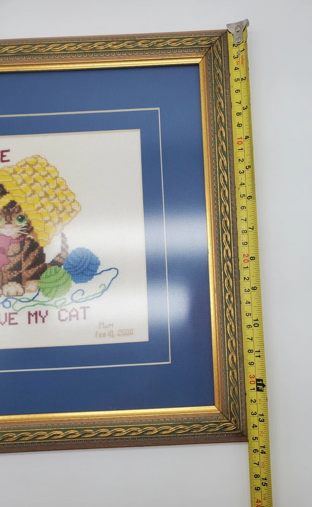 This is a Custom Framed Picture of a handmade Cross stitched, Love Me Love My Cat, Kitty In the Yarn Basket. It is stitched signed on the bottom right corner, Mom Feb 10, 2000. It has a blue matting, a gold wood frame with hints of green on it and has a paper backing that remains in tact. The custom framing info sticker also remains in tact on the back. It measures approximately 13 3/4" x 14 1/2". There is an area on the bottom, edge of the frame that has some scuffing. **See all photos of details ** This is on Good, Pre-owned condition. Shipped with USPS Priority Mail.