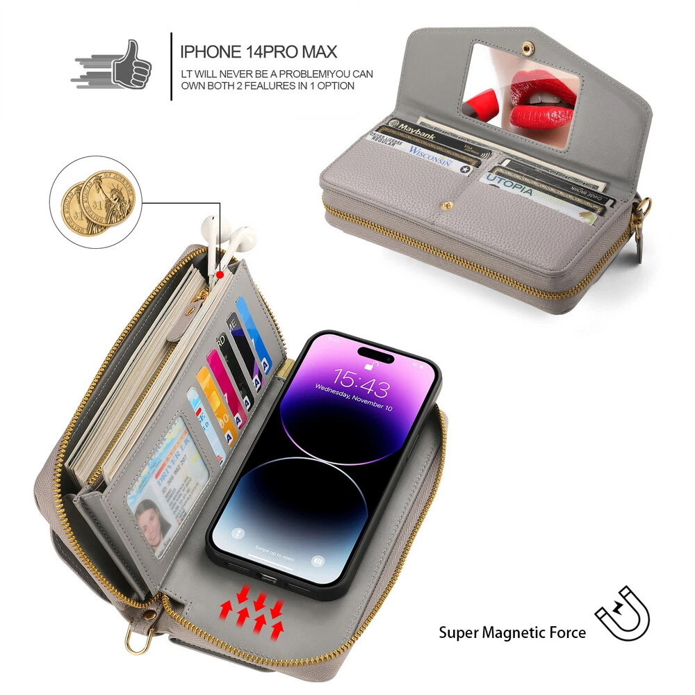 Description Women Leather Wallet Crossbody Phone Bag Removable Magnetic Case Cover For iPhone Samsung Video will open in a new window Using the eBay App? Paste link into a browser window: [isdntekvideo] [Large-capacity wallet] Built-in multifunctional cash purse, card slots, and side card holder. Card slot zipper wallet can store more credit cards, cash, change, keys, etc. RFID blocking protection design, prevent your private credit card information from stealing by data thief, keep your private property in safety. ️Due to the different sizes of mobile phones, the size of wallets and the number of card slots also vary. If necessary, please contact our customer service to confirm it for you. [Slim Detachable Back Shell] Both the inner shell and leather case have built-in magnets, which can stably fix the inner shell in the wallet without shaking. When you need to slip it into jeans pockets, you can toss out the bulky outer wallet part, can be used as a seperate single back cover, now you can take photos with the slim TPU shell. This new detachable wallet means to bring more flexibility to everyone. [Magnetic Magsafe Charging Cover] Built-in magnetic circle on the back shell, that support Apple Magsafe wireless charger for iPhone 12 and newer iPhone. ️NOTE : For iPhone 6/6s/6 Plus/6s Plus/7/8/SE 2020/SE 2022/X/XS/XS Max/XR/11/11 Pro/11 Pro Max and Samsung series Phone cover does not support magsafe charging. [Essential for women] There is a small bag and a small mirror on the outside of the wallet. The small bag can store some cosmetics and makeup tools, such as lipstick, eyebrow pencil, etc. With it, you can touch up makeup at any time. [Safe carrying] Included the telescopic wristband, hand strap, crossbody strap, you can easily carry it in different ways. Package Content: 1x Zipper Purse Detachable Leather Wallet Case Magnetic Cover 1x Crossbody Strap 1x Hand strap Please Read The Following Carefully! ⭐️ The pictures shows as a sample, perhaps it looks like the hole position may not match your phone, while the item you get will be delivered with your chosen model. Don't worry about the wrong hole position. ⭐️ Physical and pictures colour may be slightly different, because the brightness problem and color settings. If you are concerned about color differences, please do not purchase it. Please kindly understand, thanks! ⭐️ This product is compatible with more phone models, but not all are listed. If you cannot find your phone model, Please feel free contact us. ⭐️ If you do not know your phone model, please check "General -- About " or "System--About Phone" in setting.