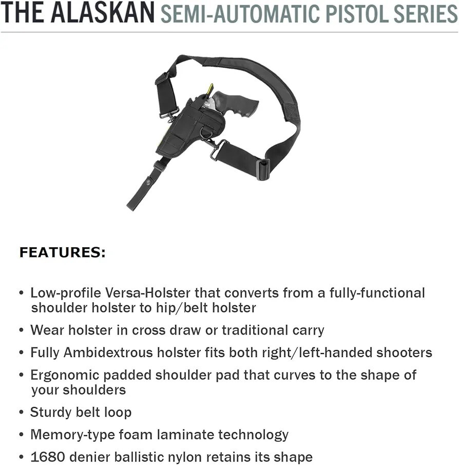 1. This holster is a game-changer for comfortable, versatile carry! The Alaskan's low-profile design works perfectly as both a hip and shoulder holster, and the ambidextrous feature is a huge plus. The ballistic nylon and memory foam molding ensure a snug, secure fit without sacrificing quick access. Switching between crossdraw and traditional carry is effortless, making it ideal for any situation. Super durable yet surprisingly lightweight—absolutely worth it for anyone needing reliable pistol retention and comfort all day. Hands down one of the best convertible holsters out there!