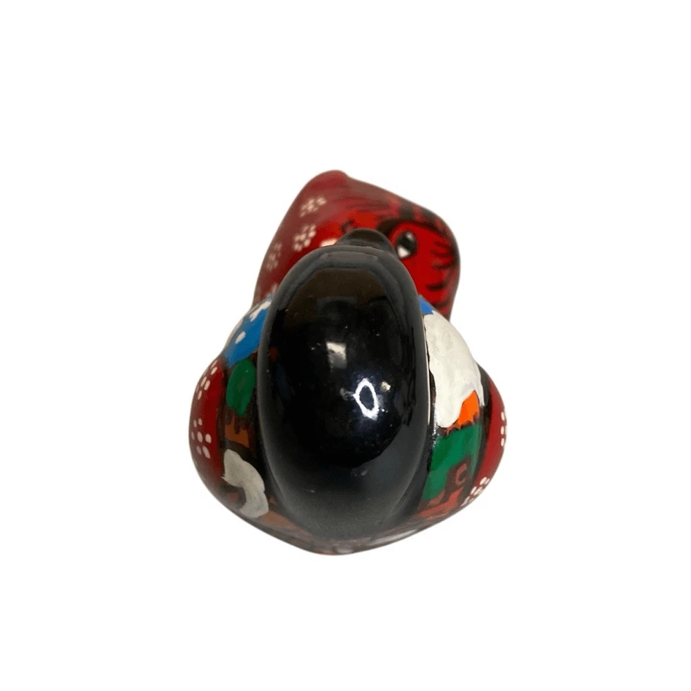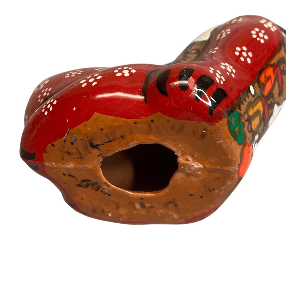 Crouching Mexican Folk Art Red Clay Tonala Cat Whimsical Hand Painted This beautiful handcrafted cat figurine is a stunning example of Mexican folk art. Made from red clay using traditional techniques, it features intricate details that showcase the rich culture of Tonala. No chips or cracks noted. Measures approximately 3.5” tall x 2.25” wide x 4” long.