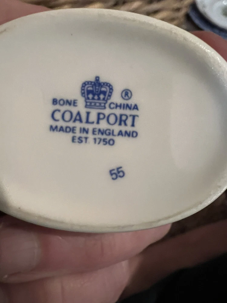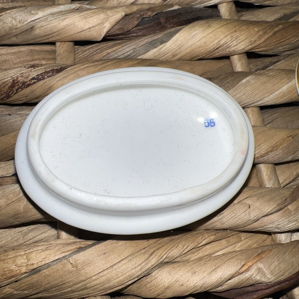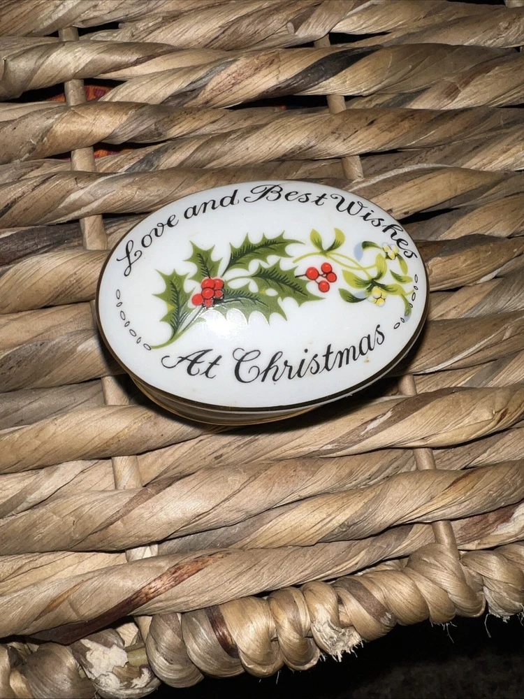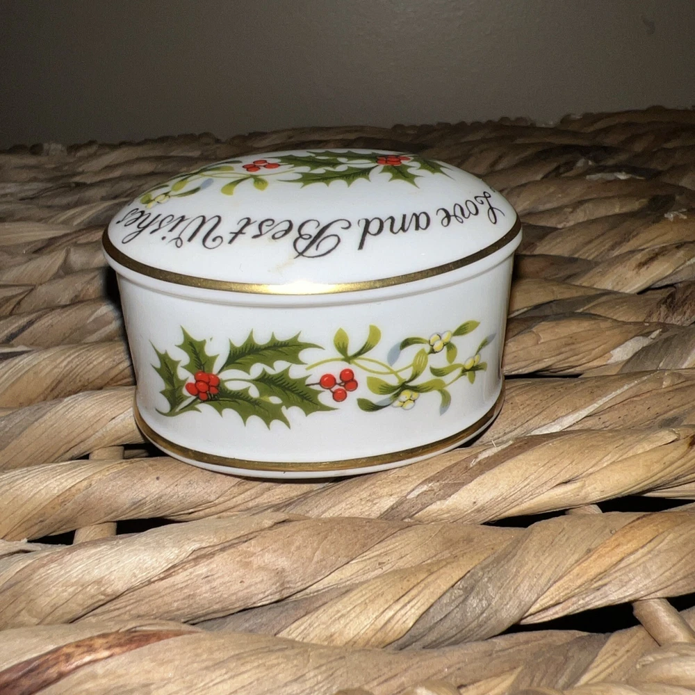 The Crown Staffordshire Bone China Love & Best Wishes Christmas Oval Trinket Box with Lid is a small trinket box made of bone china. It features a floral pattern of painted holly flowers, perfect for Christmas. The box is oval in shape and has an English style, part of the Love collection. It was manufactured in the United Kingdom in the 1980s by Crown Staffordshire. New without box