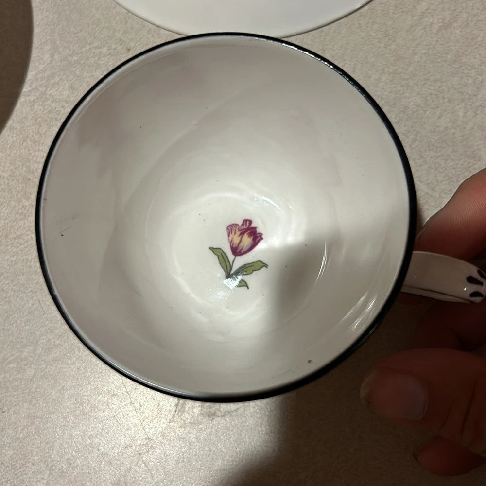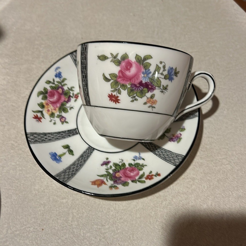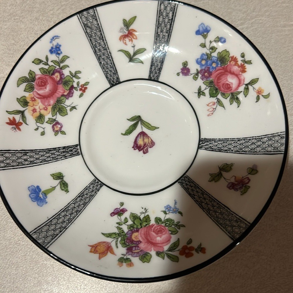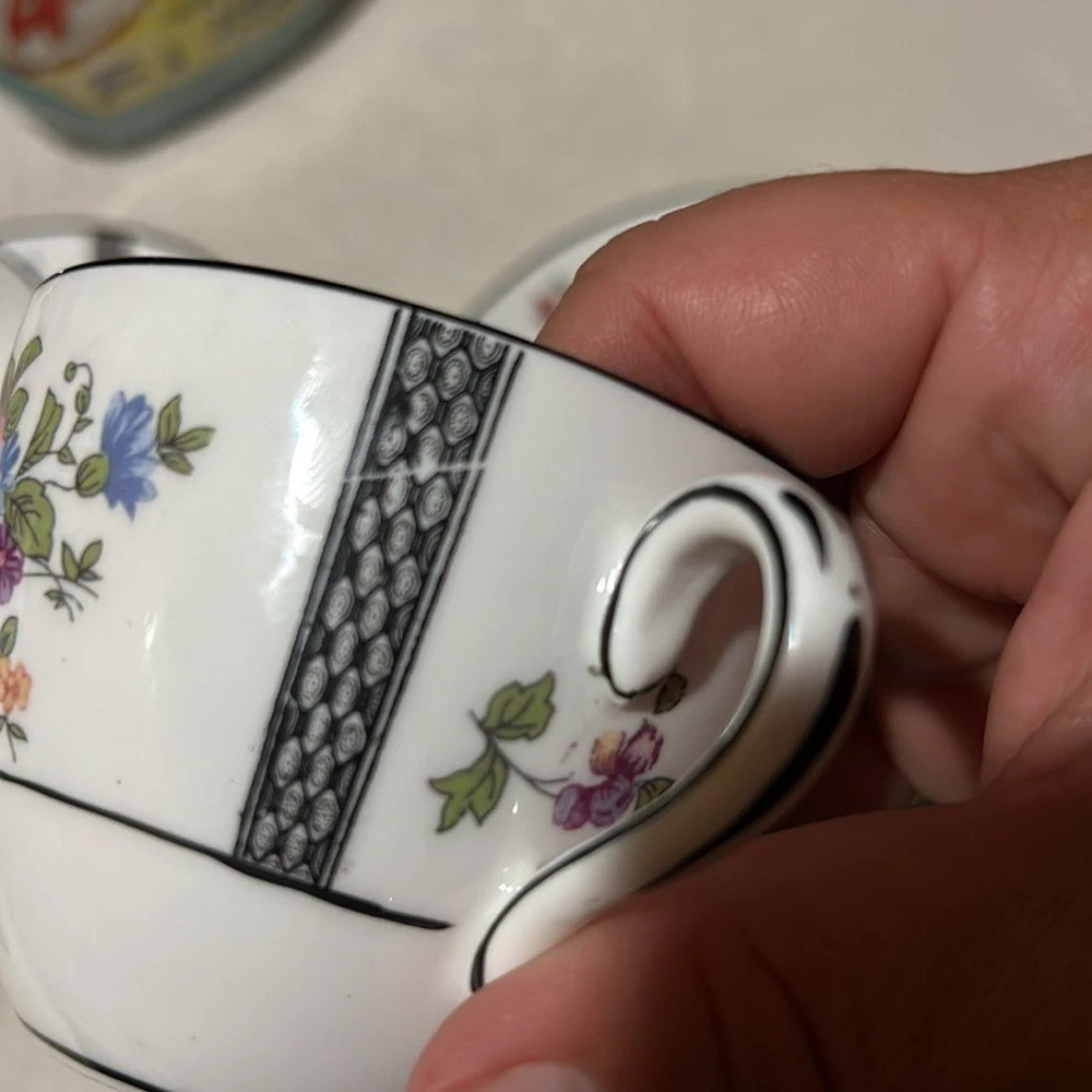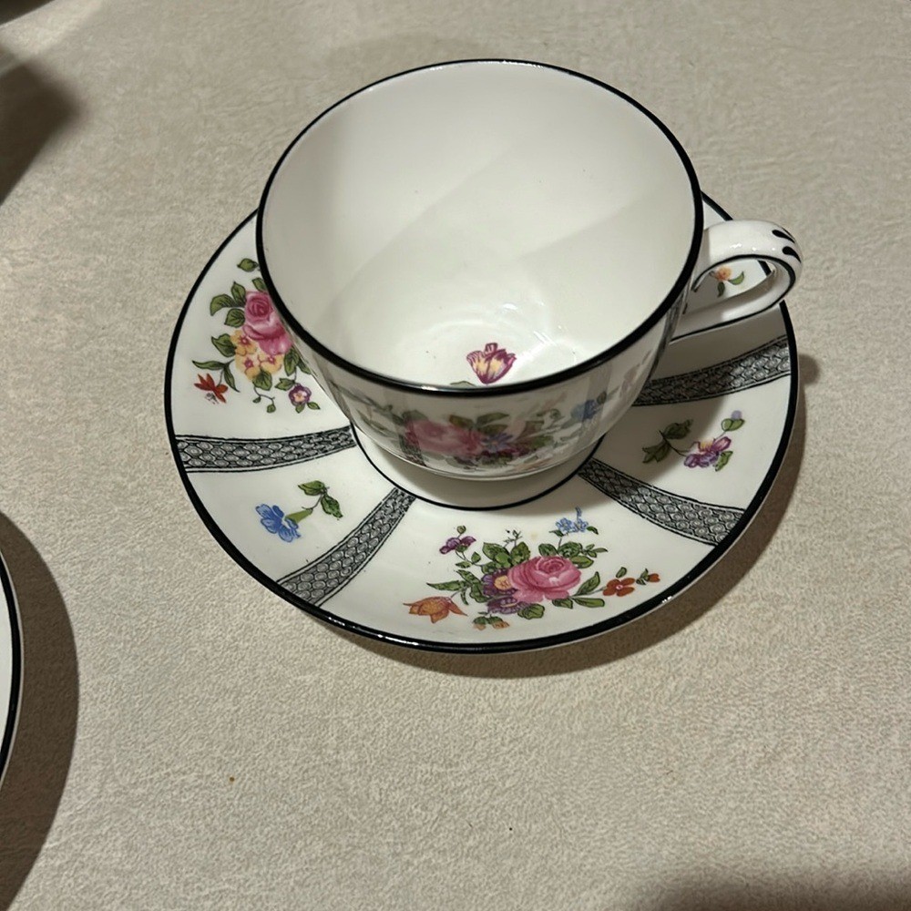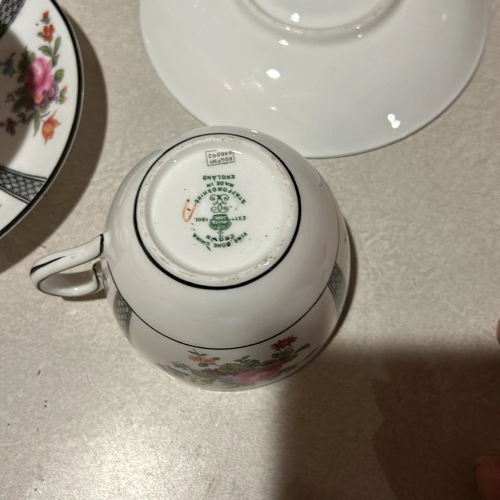 Beautiful Crown Staffordshire Bone China English Tea Cup & Saucer Set. 2 cups and 2 saucers Cup measures 2 1/2" tall with a 3 3/8" top diameter. Saucer is 5 1/2" in diameter. White base color with floral design spray and black trim with lattice lines. See pictures the black is worn.