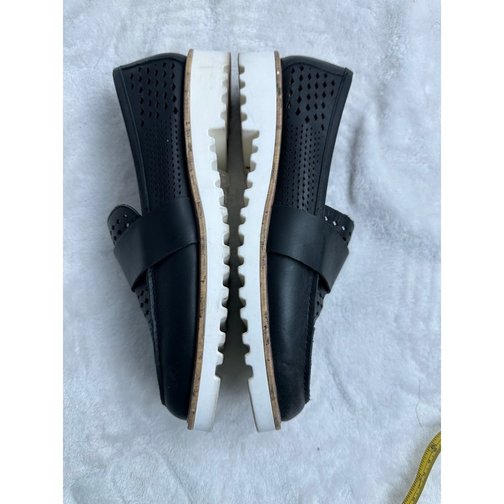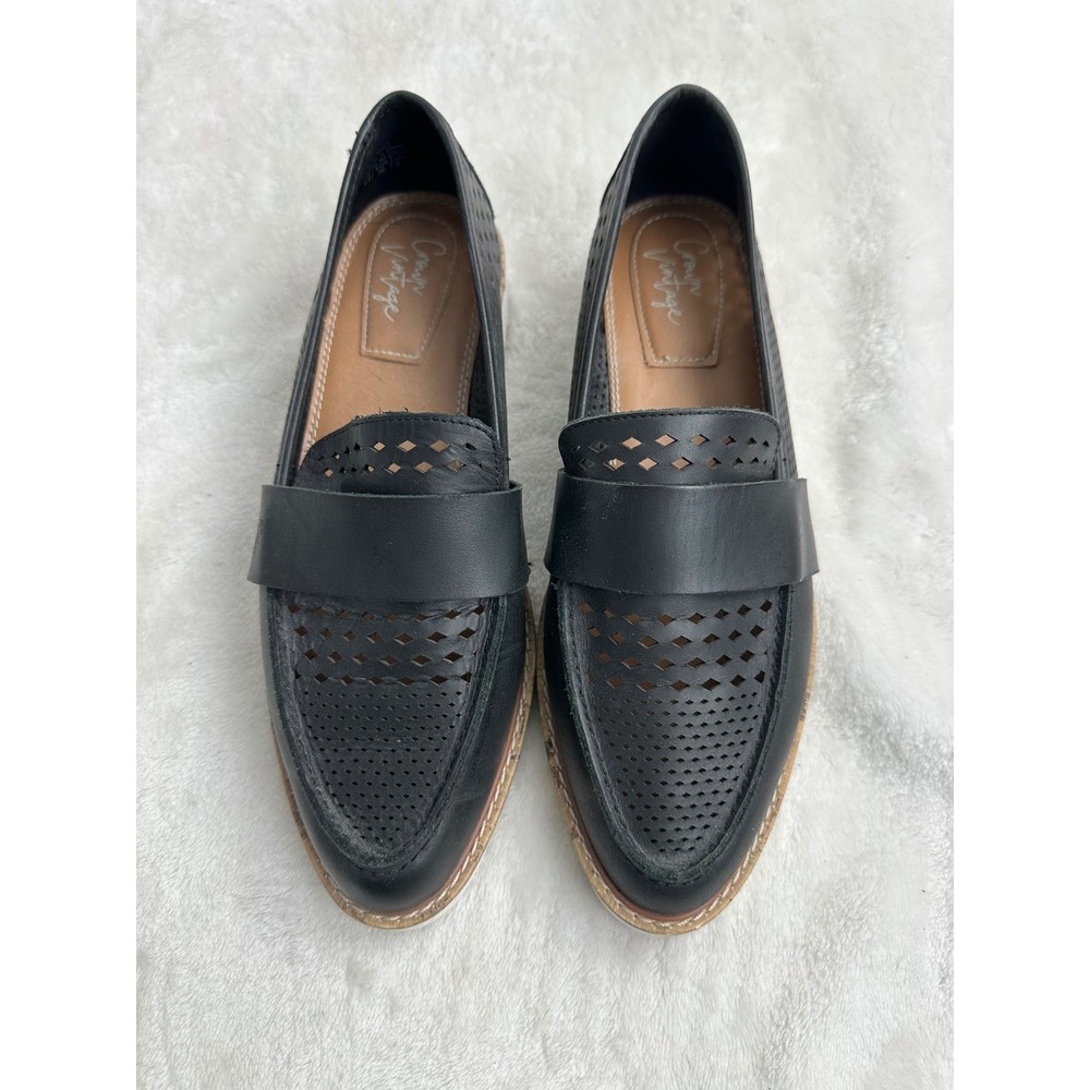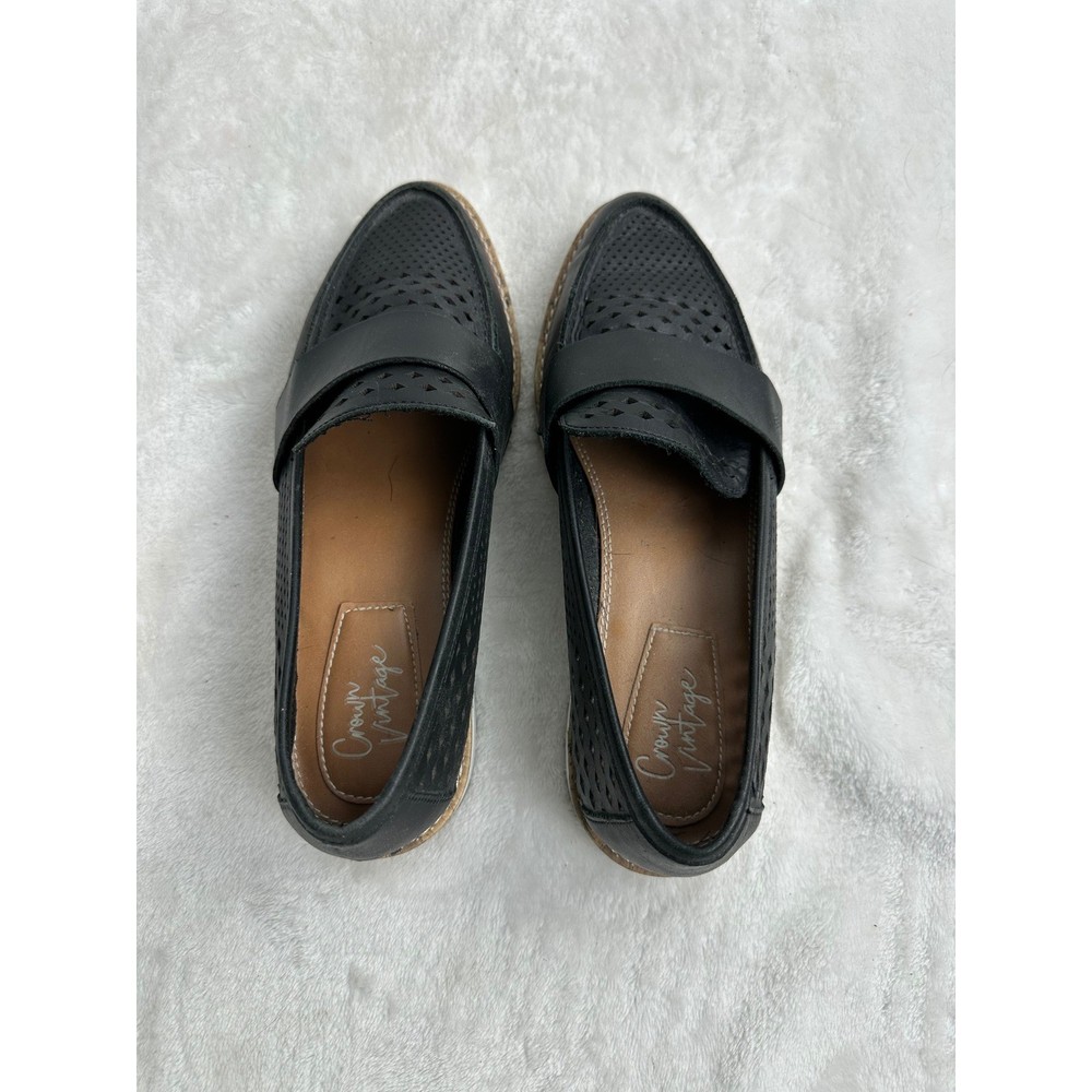 Crown Vintage Miaa loafers offer a modern twist on a classic silhouette with their intricate laser-cut perforated uppers and chunky platform lug soles. These slip-on shoes feature a smooth leather-like strap across the vamp and a pointed toe for a refined look, balanced by the sporty white serrated outsoles that provide both height and traction. The breathable design makes them an ideal choice for transitioning through seasons while maintaining a polished aesthetic. Brand: Crown Vintage Model: Miaa Style: Loafer / Platform Color: Black / White Material: Synthetic Upper Toe Shape: Pointed Closure: Slip-on Sole: Lug Platform Detail: Perforated / Laser-cut Heel Height: Approx 1.5" Platform Height: Approx 1" Keywords: Dark Academia, Preppy, Coastal Grandma, Minimalist, Summer Goth, Workwear, Business Casual, Breathable, Lightweight, Lug Sole, Chunky, Edgy, Transitional See photos for measurements. Ships from a pet friendly, smoke-free home. Contact me with any questions.