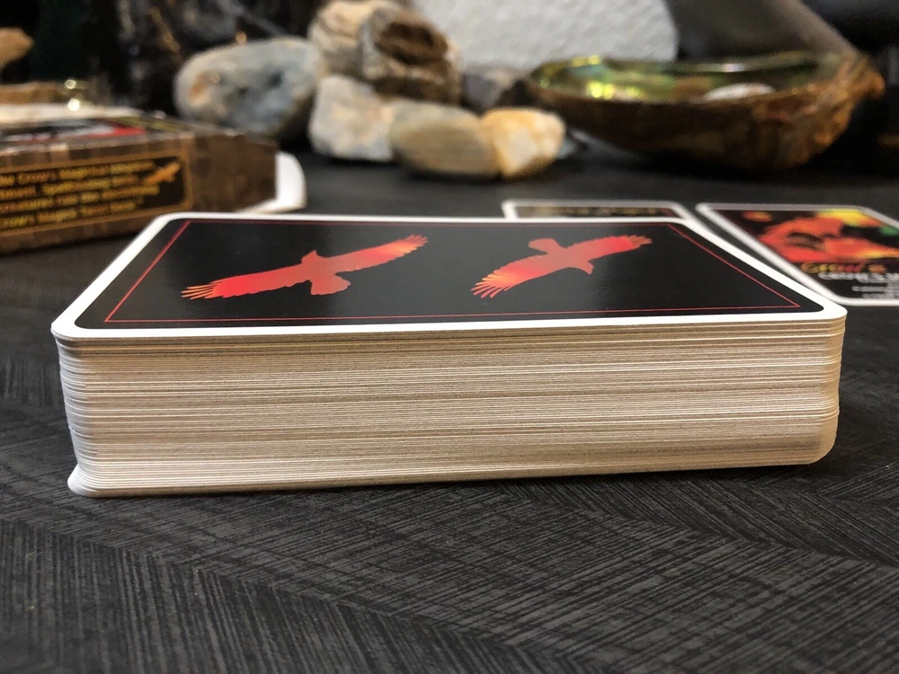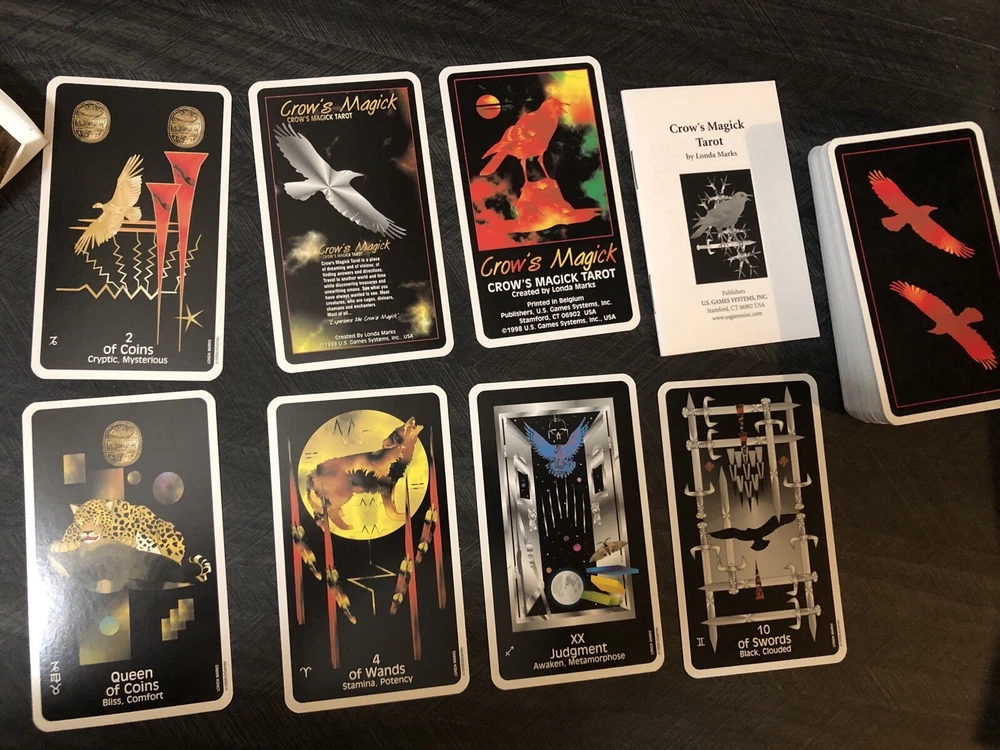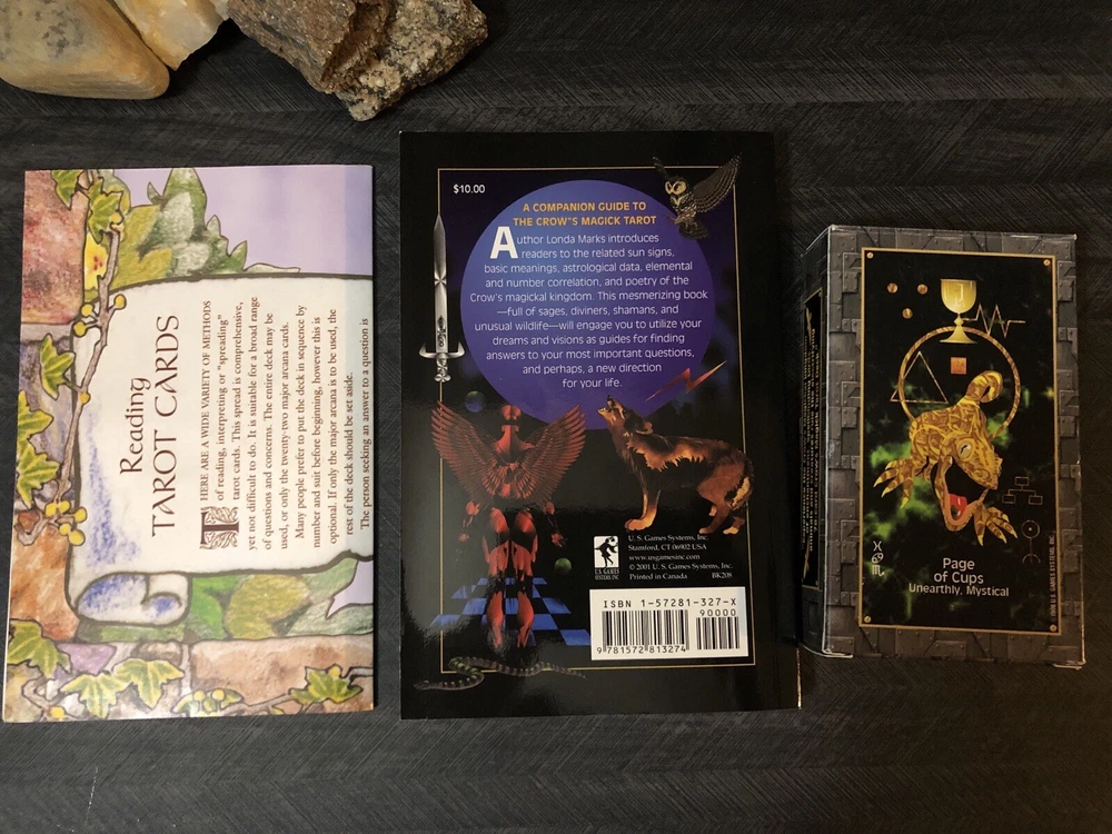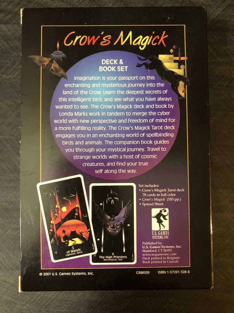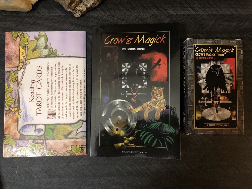 Crows Magick Tarot complete box set includes complete tarot deck with little white book, large guidebook (rare) and US games tarot spread sheet. Deck, guidebook and spread sheet are in amazing condition. Box that the set comes in shows some wear from storage. Tarot and oracle lover, decluttering, check out my other listings.