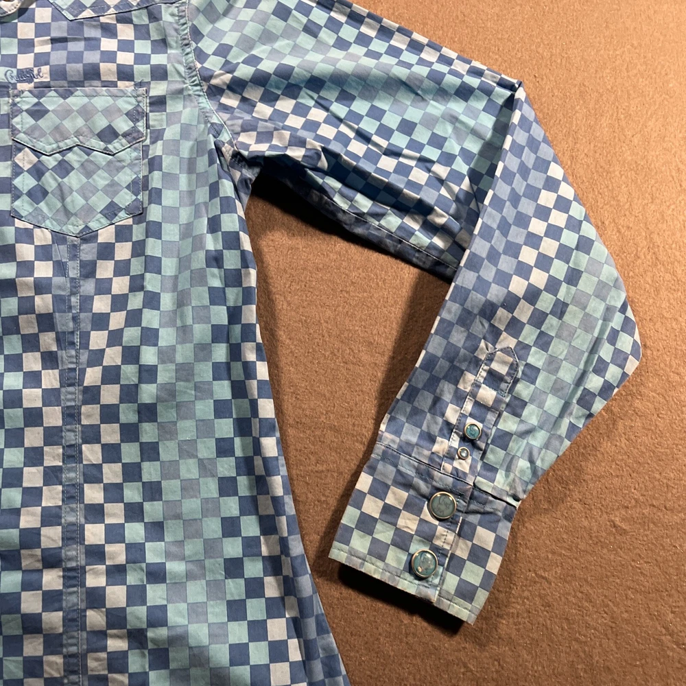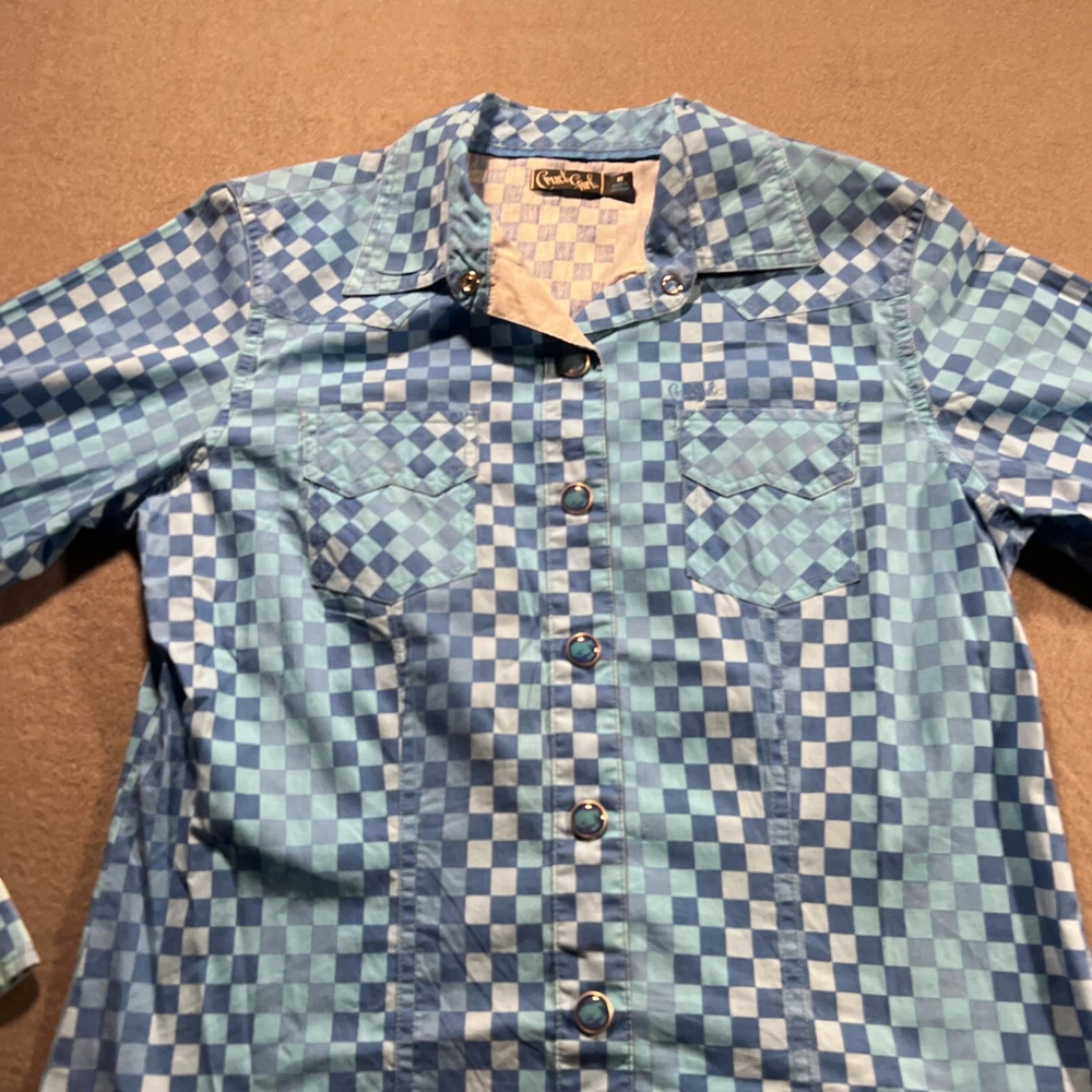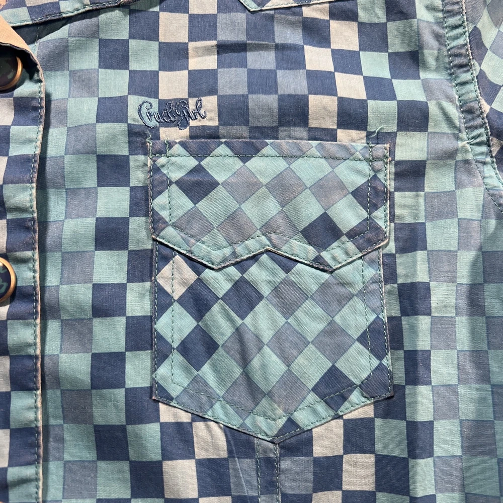 *Please review all photos closely before purchasing due to shirt having mild signs of use and wear and right back sleeve having several faint color fade areas from washing/use to prevent return.* Elevate your wardrobe with this stunning Cruel Girl shirt in a beautiful shade of blue. The shirt features a collared neckline with plaid pattern and pearl snap closure, perfect for any occasion from casual to formal. Made of 100% cotton, this shirt is machine washable and has a regular fit. The long sleeve shirt has a woven fabric type and comes in a women's size medium. It has accents of the brand's logo and features a slimming, easy care, lightweight, stretch, and all-season design. It also has pockets and is wrinkle-resistant, making it the perfect travel companion. This shirt is suitable for any season, whether it's winter, summer, fall, or spring. Add this elegant and bohemian shirt to your collection today! Rodeo Horse Back Riding Cowgirl Ranch Rancher Farm Farmer Barrel Racing Pole Bending Church Wear Dress Up Pearl Snap Shirt Collection Country Western Wear Checkered Plaid