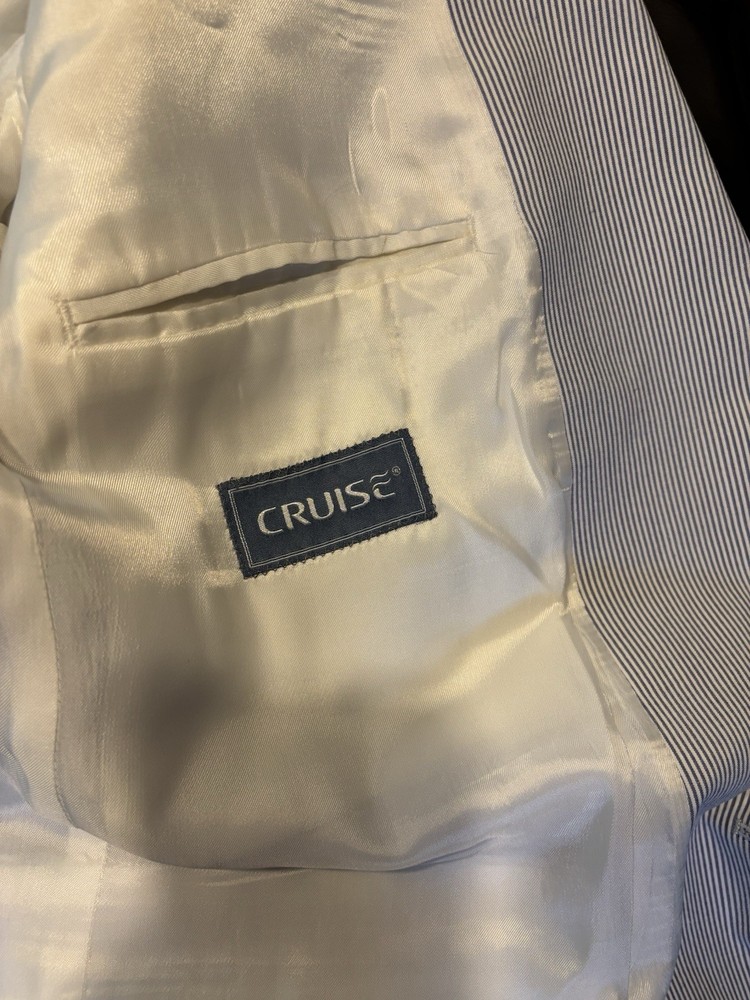 The Cruise Mens Blazer Jacket in Blue and White Striped is a stylish and classic piece for men looking to add a touch of sophistication to their wardrobe. This regular fit blazer features a timeless striped pattern in blue and white, making it a versatile option for various occasions. The blazer is designed in a one-piece style with a regular jacket/coat length, perfect for a polished and put-together look. With a size 40 and quality construction, this blazer is a great addition to any man's clothing collection.