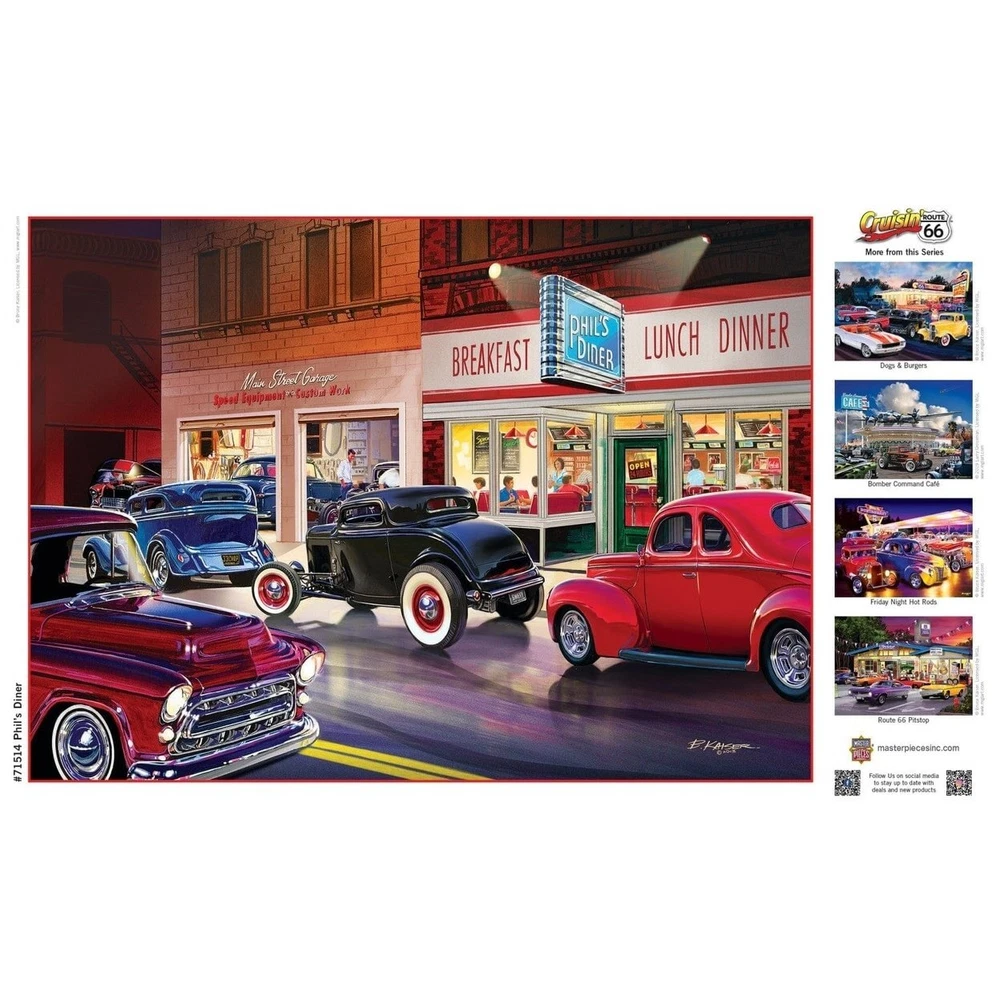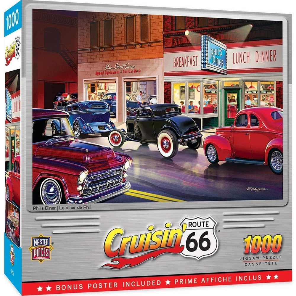 This MasterPieces 19.25" x 26.75" 1000pc Cruising Puzzle is perfect for all vintage car fanatics! Artists Bruce Kaiser and Hiroaki Shioya bring the 50s nostalgic scene to life with their vivid depictions of Hot Rods and smoking tires. Complete with several 50s town cars cruisin down main street, right past an old auto shop and a booming 50s diner, this puzzle is the perfect gift for anyone who appreciates the good old days! To reduce its impact on our environment, the chipboard used in this puzzle is made of 100% recycled material. Cruisin Route 66 - Phils Diner 1000 Piece Jigsaw Puzzle This MasterPieces 19.25" x 26.75" 1000pc Cruising Puzzle is perfect for all vintage car fanatics! Artists Bruce Kaiser and Hiroaki Shioya bring the 50s nostalgic scene to life with their vivid depictions of Hot Rods and smoking tires. Complete with several 50s town cars cruisin down main street, right past an old auto shop and a booming 50s diner, this puzzle is the perfect gift for anyone who appreciates the good old days! To reduce its impact on our environment, the chipboard used in this puzzle is made of 100% recycled material. Product Attributes: Weight (lbs.) : 1.25 lb UPC: 705988715143 Brand: MasterPieces