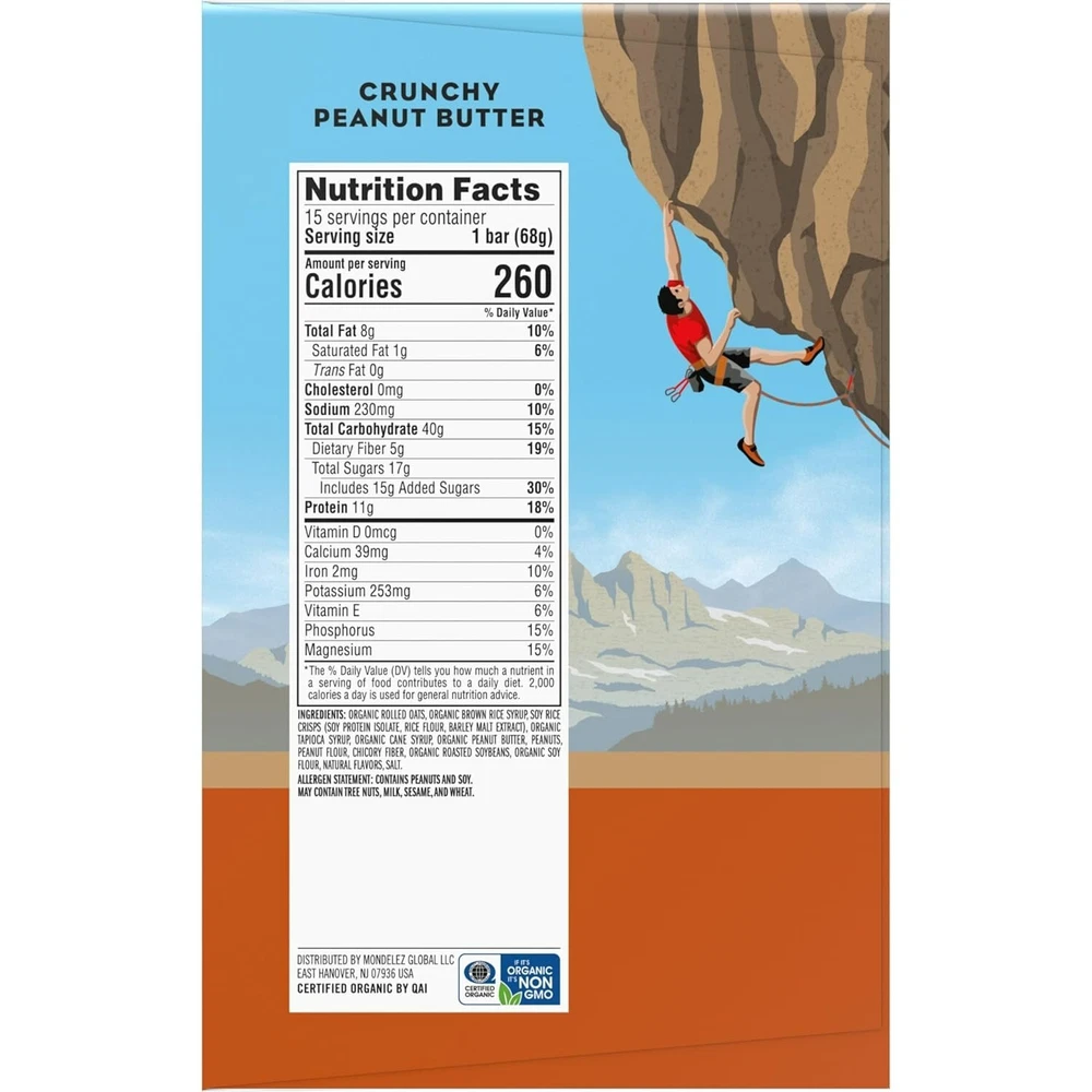 Crunchy Peanut Butter - Made with Organic Oats - Energy Bars - Non-GMO - Plant Based Protein Bars 15 Pack PEANUT BUTTER PERFECTION: Includes one 15-pack box of Crunchy Peanut Butter energy bars made with crunchy peanuts and organic peanut butter for a taste you’ll go nutty for (packaging may vary) QUALITY INGREDIENTS: Non-GMO protein bars contain 11g of protein and are made with plant-based ingredients like organic rolled oats and no high fructose corn syrup - sustaining your energy never felt (or tasted) so good SUSTAINED ENERGY: is purposefully crafted with a mix of protein, fat, and carbohydrates to sustain active bodies before and during long, moderate-intensity activity CRAFTED WITH PURPOSE: energy bars are made in 2 LEED certified bakeries that use renewable electricity including on-site generation and/or the purchase of renewable energy credits (RECs) ON-THE-GO ENERGY: Whether you need sustained energy for hiking, climbing, or a long bike ride, delivers delicious energy that’s all wrapped up and ready to go Born on a 175-mile bike ride, energy bars are purposefully crafted with a mix of protein, fat, and carbohydrates to help sustain active bodies before and during long-lasting activity. energy bars are made with quality ingredients like wholesome organic rolled oats and no high-fructose corn syrup, and they are non-GMO and plant-based for a granola bar you can feel good about. As part of the CLIF product mission, our 2 LEED certified bakeries and Emeryville, CA office run with the help of on-site solar arrays and/or offset electricity through the purchase of renewable energy credits (RECs). From Energy Bars to Builders Protein Bars and Zbar Snack Bars, our products turn grabbing a bar into raising your bar.