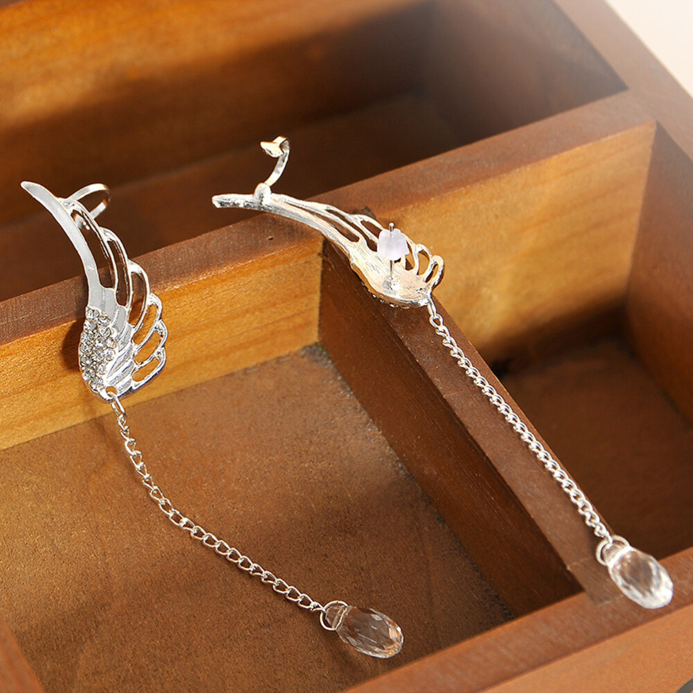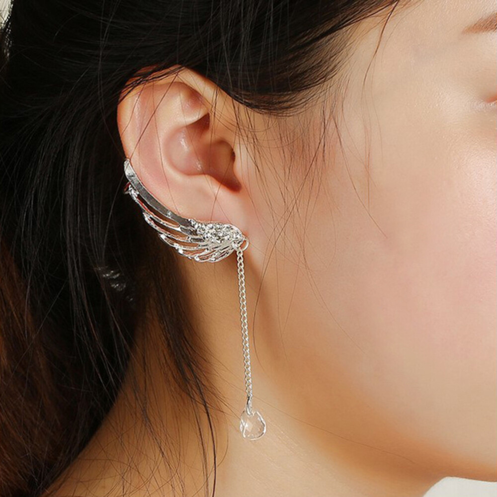 Crystal Angel Wing Dangle Earrings with Delicate Water Drop Ear Cuff Design
