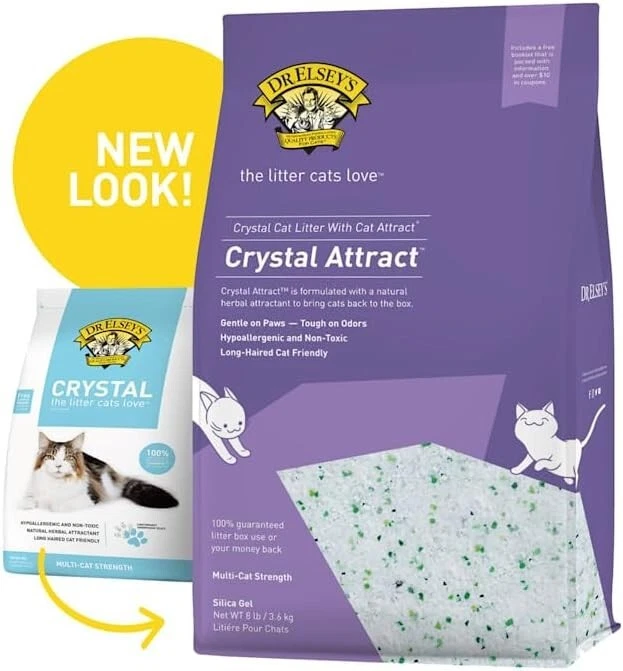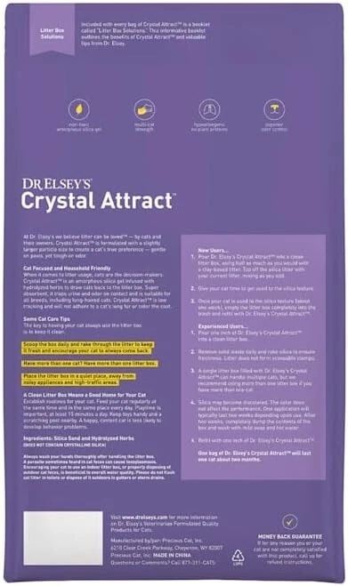 Silica gel litter infused with hydrolyzed herbs draws cats to the litter box. Particle size long haired cats prefer, won't adhere to or color kitty's coat. Traps urine and odor on contact. Hypo-allergenic and non-toxic. Easy to scoop, low tracking formula. Amorphous Silica Gel Hydrolyzed herbal attractant