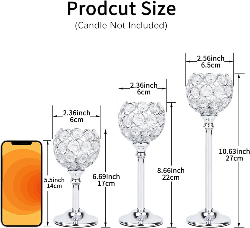 Crystal Candle Holders Set of 3 Candelabra, Silver Candle Holder Candlestick Holder for Wedding Decor, Dining Table, Silver Centerpiece Bridal Shower Coffee Table Decor [Candle Holders for Table Decor] Our Exquisite and Elegant candle holders set is composed of multi-cut crystal beads and high-quality metal, with an elegant shape. The silver candle holder will reflect a pattern that looks pretty on the table. [Crystal Table Candelabra tall candle holders] The Gorgeous crystal decorations for home including 10.6"x2.5",8.7"x2.4",6.7"x2.4"total 3pcs, the tea light candle is very suitable for decoration, such as wedding crystal candle holders set of 3 tall, party silver candle, Bedroom silver crystal candle holder, dining table centerpieces, Kitchen tall glam candle stands,crystal candle holders set of 3, Bar bling candles, silver crystal candle holders, Hotel candle holder silver set of 3, Restaurant silver candlestick holders, etc. [Centerpieces for tables Set of 3 ] The candle holders for table centerpiece has 3 different height candle holders, the Candle plate Dia is 1.5'', this is a very nice practical decoration, It is a right size for your dining room , this long candle holders can give your room a nice atmosphere (Candle not included). [Candle Holder Centerpiece for Valentine's Day] First-class crystal beads silver candelabra, Elaborate cut, when sunlight hits the crystal ball, there will reflect rainbow light, very beautiful! silver centerpieces for tables base is made of silver painted metal, Safe and reliable. [Unique living room centerpieces for table] The candle stick holder for table has a cryatal wire cup design, This fancy candle holder will definitely add luster to your space,decoration for table dining room. Shipping We offer FREE shipping on all orders! We ship within Three business days of payment, usually sooner. We use a selection of shipping services such as UPS, FedEx, USPS etc. We only ship to the lower 48 states, no APO/FPO addresses or PO Boxes allowed. Local pickups and combined shipping options are not provided at this time. International buyers – please note: Import duties, taxes, and charges aren't included in the item price or postage cost. These charges are the buyer's responsibility. Please check with your country's customs office to determine what these additional costs will be prior to bidding or buying. Order Cancellation Policy * Order Cancellation Policy ** You can return a product for up to 30 days from the date you purchased it. 1. The seller reserves the right to cancel the special case only due to eBay cancellation fee. 2. The decision of seller is the final. 3. The seller will respond to the cancellation request within 2 business days. Please wait for the result of cancellation. 4. In case the cancellation is not completed by some reasons, the buyer can follow the options below to get the refund. 4.1 The buyer can reject the item when it arrives. 4.2 The buyer can send the item back to the seller within 30 days If the buyer receives item (USA Shipment ONLY). The seller will provide the FREE return label to the buyer when the buyer opens " Return Item" case on eBay by using the reason as "Change my mind" ONLY. 5. When buyer has placed the order. The order will be processed and completed by automatic warehouse system within 5 minutes. In case that buyer sends the cancellation request after 5 minutes of placing the order, the request will be rejected. **Sending direct message to cancel the order is not allowed for every case.* Return Policy - If buyer would like to return the items for refund or replacement, please CONTACT SELLER to receive the free return label from seller. The refund or replacement will be processed with the tracking number of return label which is provided by seller only. The other ways of return which are not approved by seller will not be processed for the refund or replacement. Return You can return a product for up to 30 days from the date you purchased it. Any product you return must be in the same condition you received it and in the original packaging. Please keep the receipt. Payment We accept payment by any of the following methods: eBay Payments Please pay as soon as possible after winning an auction, as that will allow us to post your item to you sooner! Feedback Customer satisfaction is very important to us. If you have any problem with your order, please contact us and we will do our best to make you satisfied. Contact Us If you have any queries, please contact us via ebay. We usually respond within 24 hours on weekdays. Please visit our eBay store to check out other items for sale! Thank you for shopping at our store.