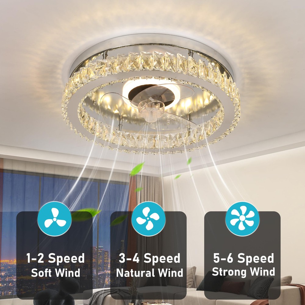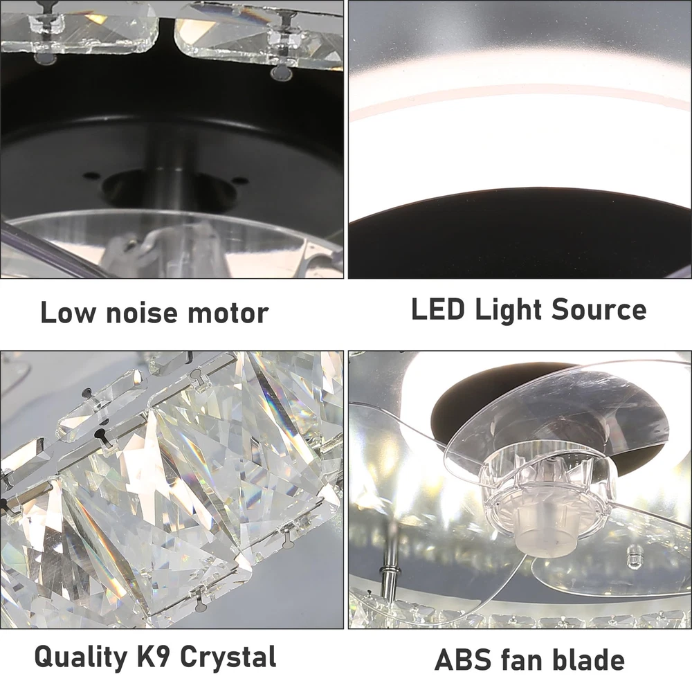 【Ceiling Fans with Lights】 Built-in LEDs light source(800K-6500K), can freely adjust the color temperature and brightness by the remote control. Power: 30W, with timing function. 【Low Profile Ceiling Fans】 Size: Diameter 18.8 inch (48cm), height 4.5 inch; Voltage:85-265V; 1 remote control, DC motor and 3 blades, applicable area 10-20㎡. 【Mute Motor and Timing】 The pure copper silent motor of the crystal ceiling fan runs smoothly without making noise, and the night mode and timing mode provide you with a quiet and comfortable sleeping environment. 【Forward and Reverse Mode】 Freely change the direction from downdraft mode during the summer to updraft mode during the winter. The ceiling fan can be used all seasons. 【Easy to Install】 Instructions and all mounting hardware are included for your easy installation. If any questions, please feel free to contact us.