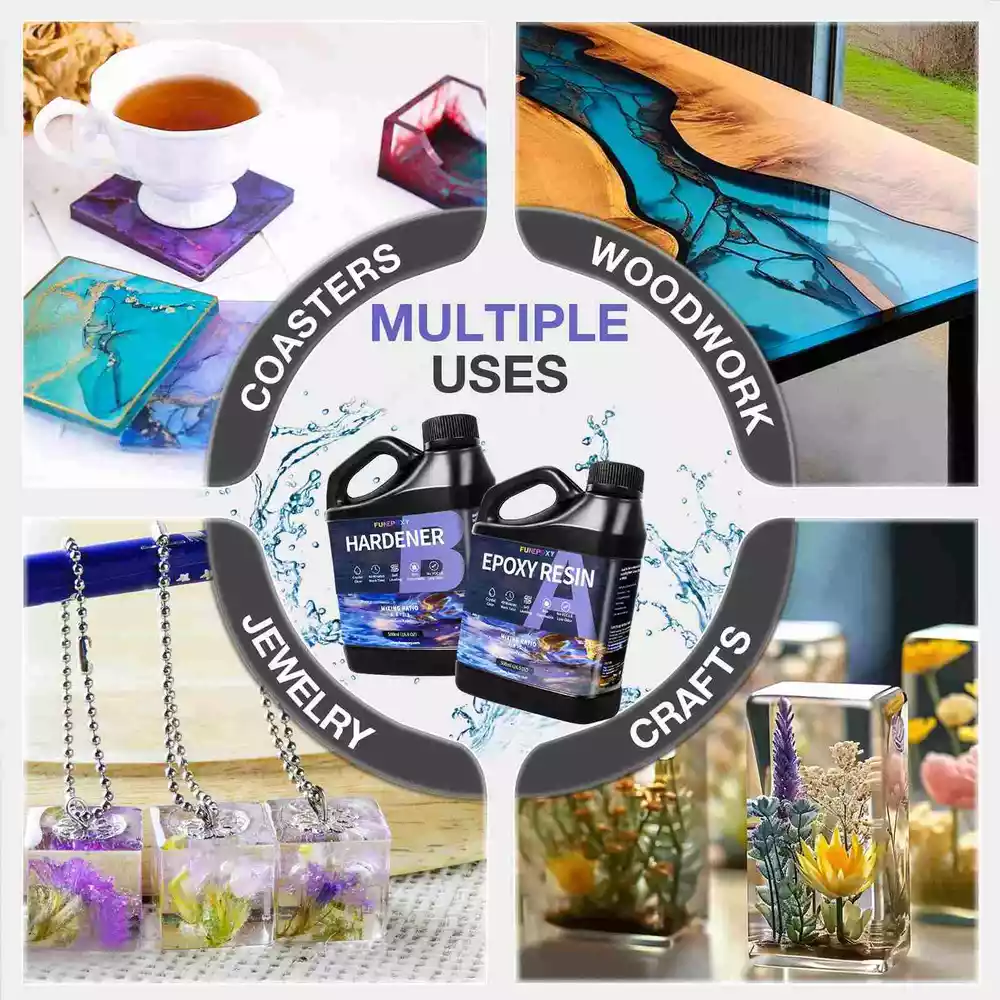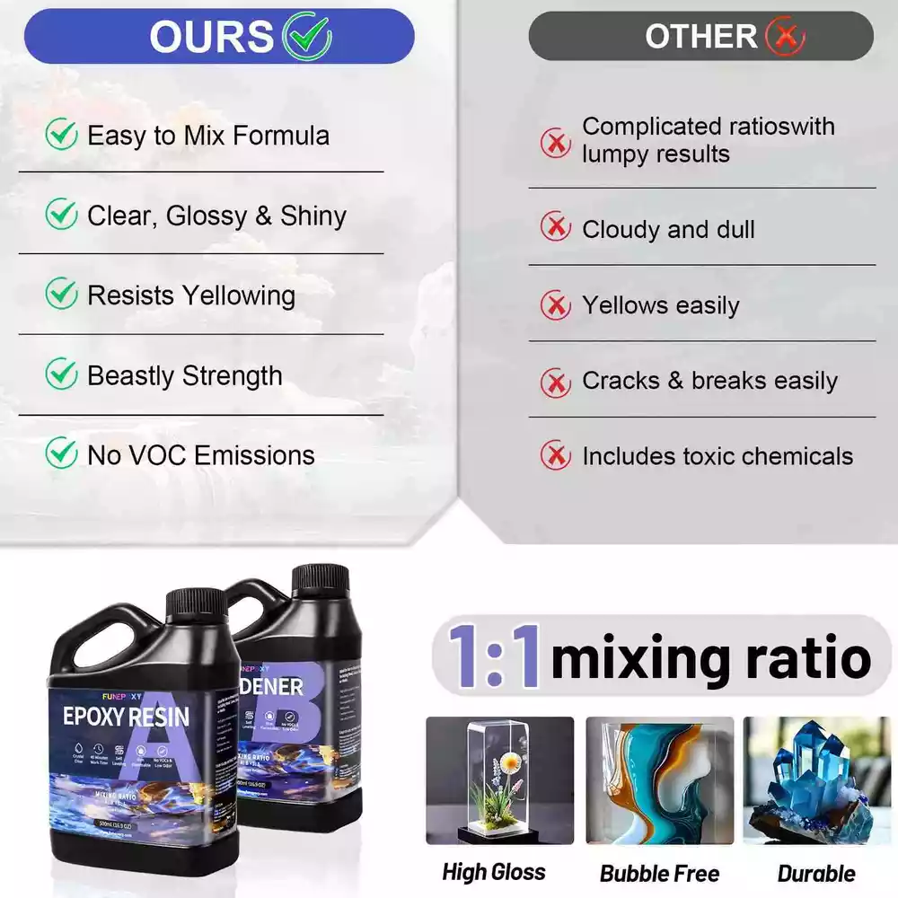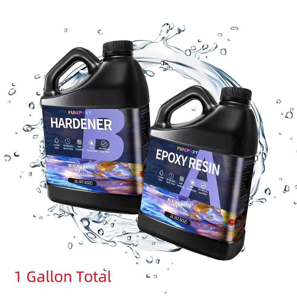 The resin 1:1 mix ratio by volume, 1 Gallon kit is volume 1 Gallon mixed, is the total volume 1 Gallon kit : 64oz resin A + 64oz hardener B (Total 1 Gallon) Features: Mix Ratio...............1:1 by volume Work time ..............45-60 minutes Hardness....................D70-80 after full cure Mixed Viscosity..........2500-3500cps. Chemical Resistance.......excellent Moisture Resistance........excellent FDA Compliant / Food grade: Yes, in its inert fully cured state Heat resistance: up to 80℃ (please don't leave hot pans on it,a coaster needed) Approximate Coverage: 12 square ft per gallon at 1/8 inch thickness Perfect for tabletops, fiberglass work, small castings (under 1.2" /3CM), electrical potting, jewelry making, concrete - pebble coating, marine applications- boat building The resin 1:1 mix ratio by volume , 1 Gallon kit is volume 1 Gallon mixed, is the total volume 1 Gallon kit : 64oz resin A + 64oz hardener B (Total 1 Gallon) package weight : 10lbs Features : Mix Ratio...............1:1 by volume Work time ..............45-60 minutes Hardness....................D70-80 after full cure Mixed Viscosity..........2500-3500cps. Chemical Resistance.......excellent Moisture Resistance........excellent FDA Compliant / Food grade: Yes, in its inert fully cured state Heat resistance: up to 80℃ (please don't leave hot pans on it,a coaster needed) Approximate Coverage: 12 square ft per gallon at 1/8 inch thickness Perfect for tabletops, fiberglass work, small castings (under 1.2" /3CM), electrical potting, jewelry making, concrete - pebble coating, marine applications- boat building, & wood water proofing - repairs. Tips for operation This product is 1:1 fast cure resin, each time mixed, pour No more than 150ml total, (that is 75ml A + 75ml B, A must be ≥ B), with a thickness range of ≤1.2" to avoid bursting. and you can go as deep as you like, just make sure to work in stages. stay under 1.2" per pour. after the surface film cures begin your second pour. the surface set time is roughly 1 hour at room temp. the full cure time is 8-12 hours in summer and 12-24 hours in winter Operation steps 1:1 ratio for A&B glue by volume (A can be 2-5% more than B to make harder) Pour into the mixing cup Along the cup wall and bottom stir it evenly for 1-2 minutes Add glitter or pigmentand if you need Slowly pour mixed resindown the mold Add other decorative Important This chemical needs to be stored in a dry, safe, temperature controlled environment. Always keep the lids tightly sealed when not in use. Remember, oxygen and moisture oxidize and can rapidly degrade the epoxy and hardener. Moisture is also a potential issue. Always keep the bottles sealed when not in use. When applying this product, use gloves, goggles, and proper safety equipment. Please refer to the safety data sheet before using any of our epoxy products. Payment Shipping details Return policy About us Contact us Payment We accept Paypal,Google Pay,VISA,Master Card,American Express and Discover. Shipping details We usually ship from US within 1-3 business days with tracking number by USPS or UPS. Return policy 30 days returns. Seller pays for return shipping. About us We are a trustworthy and professional eBay seller. Contact us If any problems about our product and service,contact us for free at any time via eBay messages. A:B Ratio 1:1(volume ratio) Brand FUNEPOXY Color Clear Handmade Yes Capacity 1 Gallon Total Volume Kit 64oz epoxy resin A + 64oz hardener B
