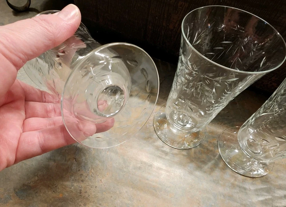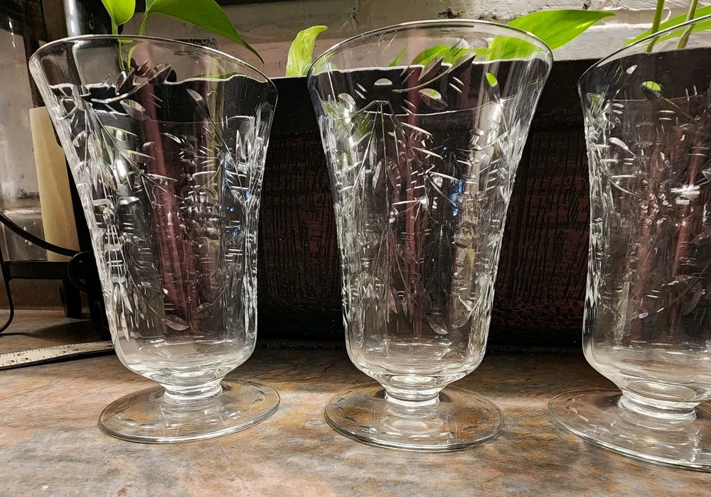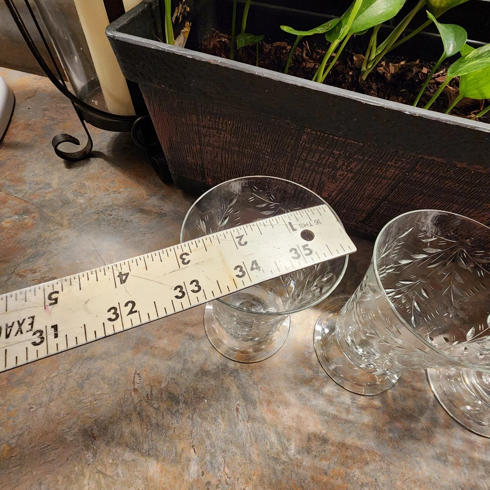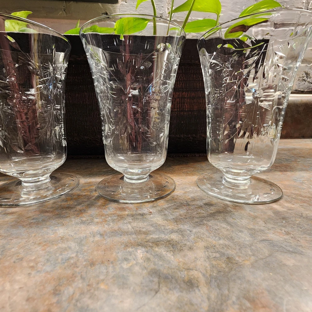 Elevate your table setting with this set of four vintage cordial glasses. Made of crystal, these glasses feature exquisite etched patterns with a floral theme. The glasses stand at 4 3/4 inches tall and are perfect for all occasions. The clear color of the crystal allows the intricate designs to shine through, making them a great addition to any drinkware collection. These glasses are a perfect representation of cut glass production style. They are a great addition to any vintage collection. Use them to serve juice or any other drink that you think will complement their beauty.