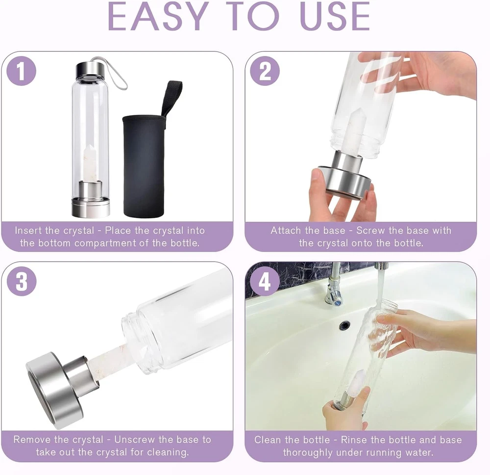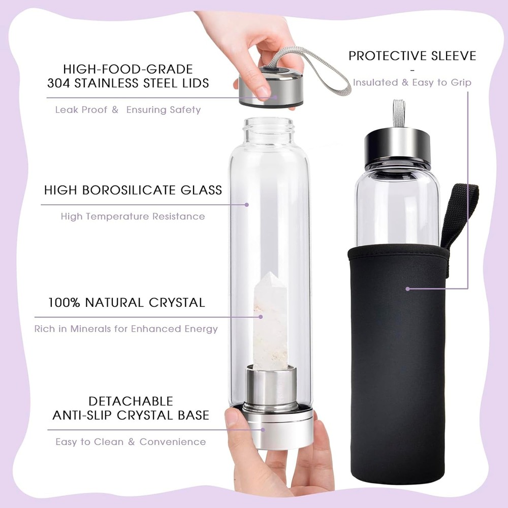 π ChezMax Crystal Glass Water Bottle β Changeable Natural Gemstone Core Elevate your hydration routine with this premium crystal glass water bottle . Infuse your drinks with the energy of natural gemstones and enjoy the benefits of wellness, mindfulness, and positive energy every day. π Key Features Premium Crystal Core : Comes with high-quality crystals such as Amethyst (love), Topaz (confidence), and Clear Quartz (purity) . Easily swap or remove crystals for personalized energy infusion. Energy Transfer & Wellness : Crystals are believed to influence the energy of water molecules, promote balance, and boost mood and vitality. Perfect for yoga, meditation, or daily mindfulness. Versatile Beverage Use : Made of high-borosilicate heat-resistant glass , safe for tea, coffee, juice, smoothies , or vitamin water. Can withstand rapid temperature changes and is non-toxic. Leak-Proof & Easy to Clean : Stainless steel cap with silicone seal prevents leaks. Detachable base allows easy crystal replacement and thorough cleaning. Gift-Ready Packaging : Includes protective sleeve and gift-ready box. Makes a thoughtful present for friends, teachers, or loved ones who enjoy wellness, crystals, or mindful living. β¨ Hydrate with intention β enjoy the beauty, energy, and wellness benefits of natural crystals every day. β‘ Easy to Use Insert the crystal into the bottom compartment. Screw the base with the crystal onto the bottle. Unscrew the base to remove the crystal for cleaning. Rinse bottle and base thoroughly under running water. π¦ Package Includes 1 Γ Crystal Glass Water Bottle (8.46β x 2.59β) 1 Γ Detachable Base 1 Γ Protective Sleeve 1 Γ Premium Natural Crystals (Amethyst, Topaz, Clear Quartz) 1 Γ User Manual