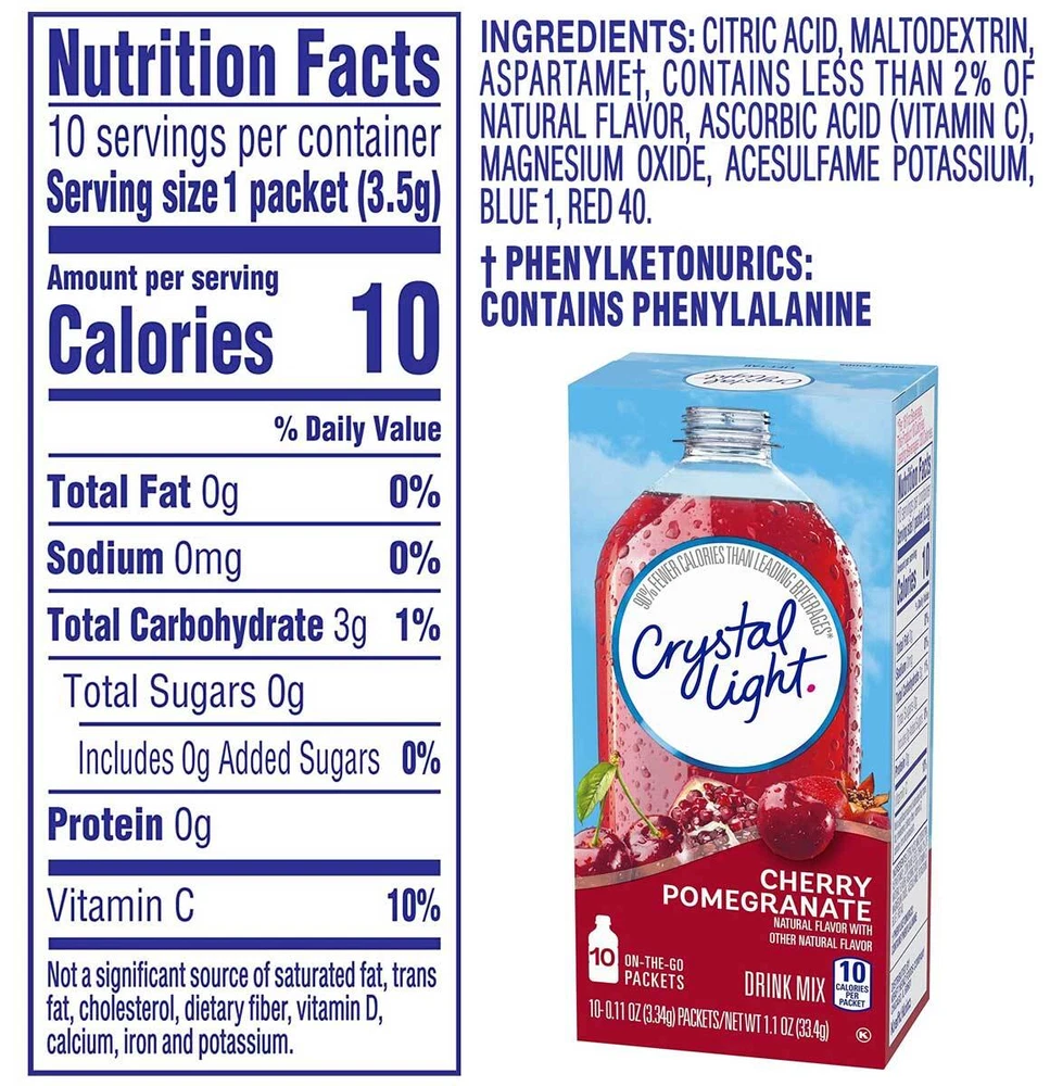 Product Details Crystal Light On-The-Go turns the water you need into the water you will love. It transforms ordinary water into the fabulous fruity flavor of Cherry Pomegranate with just 5 calories per serving. Each sip is the perfect way to refresh, renew and satisfy your thirst for something different. Brought to you by Crystal Light Size: 10 Ct (10-0.11 Oz Packets Per Box) Pack of 12 Buy In Bulk and SAVE! Upc: 043000017289 (FAQ) FREQUENTLY ASKED QUESTIONS: Payment: We accept the following forms of payment: PayPal, Visa, Master Card, American Express and Discover. Shipping: All purchases are shipped within 2-5 business days unless specifically stated on listing under Delivery Time. Shipping times are very close to what is listed on the eBay listing. Emailing us prior to the shipping time stated in the listing will not expedite the shipping time. If the shipping time exceeds the time stated in the listing, please contact us and we will look into the order. Tracking Numbers: We upload tracking numbers when the item leaves our facility. PLEASE NOTE the shipping time frame listed next to Delivery in the eBay listing. If you do not see a tracking number within the shipping time stated in the listing, then please contact us. Please make sure that our email messages don't go into spam or junk. We cannot assume responsibility for lost shipments after tracking shows the parcel has been delivered. Please contact the delivery service to investigate should this happen. Shipping Locations: We ship to the 48 contiguous United States excluding Military APO & FPO and PO Boxes. At this time, we do not ship to any International locations. P.O. Boxes and Street Addressing: We do not ship to PO Boxes, however, some of the larger Post Offices have a system called “Street Addressing” and will work with customers with a PO Box so their packages can be delivered to the Post Office street address and they will forward the item to their PO Box. This is especially beneficial in case your item is shipped via SurePost or SmartPost and will keep the item from being returned to us for an insufficient address. Please check with your local USPS Office to see if they offer this option. Shipping Service: We primarily use UPS and DHL, which can sometimes coincide with USPS, as well as USPS and FedEx. Our shipping department makes the decision of which service to use based on the weight of the package and the contents. Expedited Shipping: We do not offer expedited shipping at this time. Address Change: Please be sure your address is listed correctly in both eBay and PayPal prior to making a purchase. If you have listed the incorrect address and the item has not yet shipped, please contact us immediately and we can change the address for you. If the item has already shipped and is returned due to a bad address, a refund will be issued minus any costs incurred to us for the return of the item. Damaged During Transit: If your item arrives damaged – do not discard! The best way to receive a refund is to take pictures of the damage and send them to us. We will need a clear picture of the label, the box, and the damaged item. If you cannot send a pic, then you will need to return the item for a refund by opening a return in eBay. We do need to have validation that the item was damaged. If you throw it away, and then claim the item was damaged, you will not be refunded. No exceptions, please! Expiration Dates: Due to expiration dates constantly changing, we do not supply the expiration date as we ship large quantities daily. With that said, please note our priority is that all grocery items have a minimum shelf life of 90 days. If your product does not meet this standard, please contact us for further instruction. Please Note: Fresh baked bakery items and refrigerated items that are perishable have short shelf lives – some of these can be as little as two weeks from the date of receipt – these items are NOT covered by our minimum 90 day guarantee. Item as Pictured: While we work to ensure that product information is correct, on occasion manufacturers may alter their ingredient lists or packaging. We do upload our pictures by the UPC# (stock photos) and actual product packaging and materials may contain more and/or different information than that shown on our listing. We recommend that you do not solely rely on the image presented. If our image appears outdated, the items we carry are always the most current version of the product . The product images shown are for illustrative purposes only. Count Size/Pack Size: The count size (written “Ct”) is how many individual items are in each package. The Pack size is how many of the packages will be sent. Example: A box of cookies has 30 cookies in each package. The listing is for 6 packages. The listing will read: Cookies – 30 Ct – Pack of 6. Returns: We accept returns up to 30 days after receipt. Item must be in NEW and UNUSED condition. All returns will be inspected prior to credit being issued. Items returned must be accompanied by the original packaging and the Return Packing Slip. Credit will be issued for the purchase price of the item(s) returned. If you wish to return your item, please open a Return through the eBay returns. Refunds will be issued in the same form of payment as the original purchase. Exchanges/Replacements: We are sorry but we do not have an exchange/replacement policy at this time. We ask that you re-purchase the item and return the unwanted item. You may return a product within 30 days of receiving your item. Please see our Return Policy above. Customer Service: To contact Customer Service, please go to the listing page for the item you have a question about and click on Contact Seller in the Seller Information text box. Our business is open during normal business hours, so please allow an appropriate amount of time for a response. Feedback: We leave feedback as soon as payment is made. We do ask our customers if for any reason they are not 