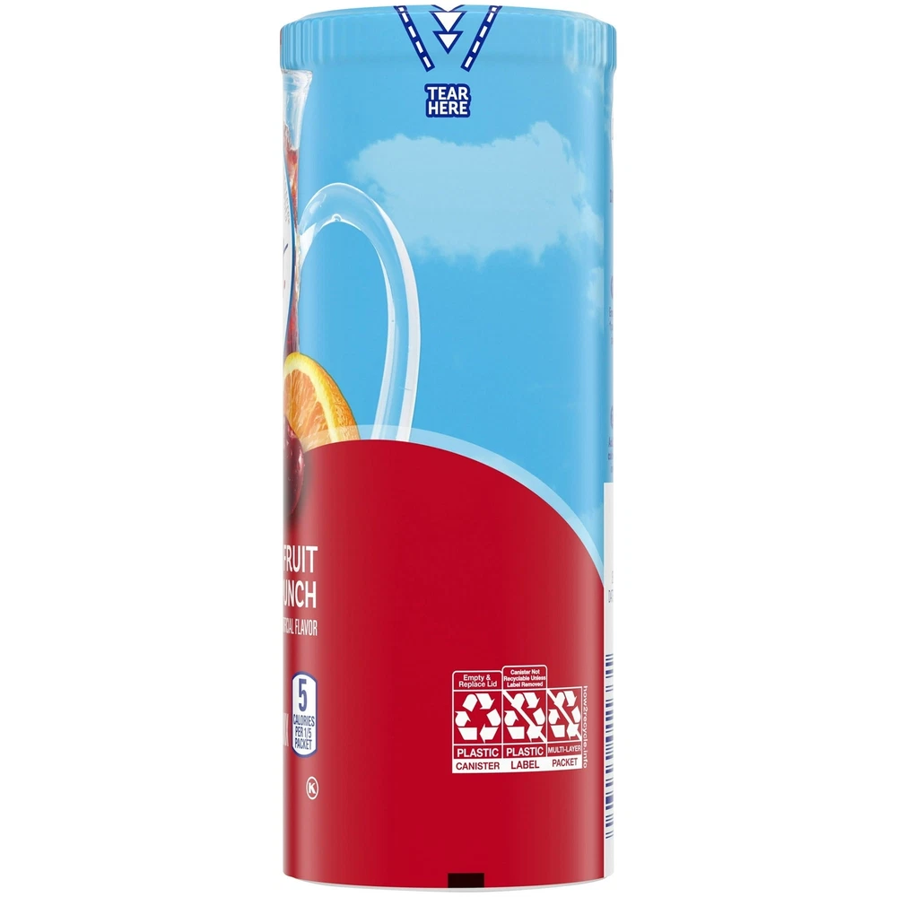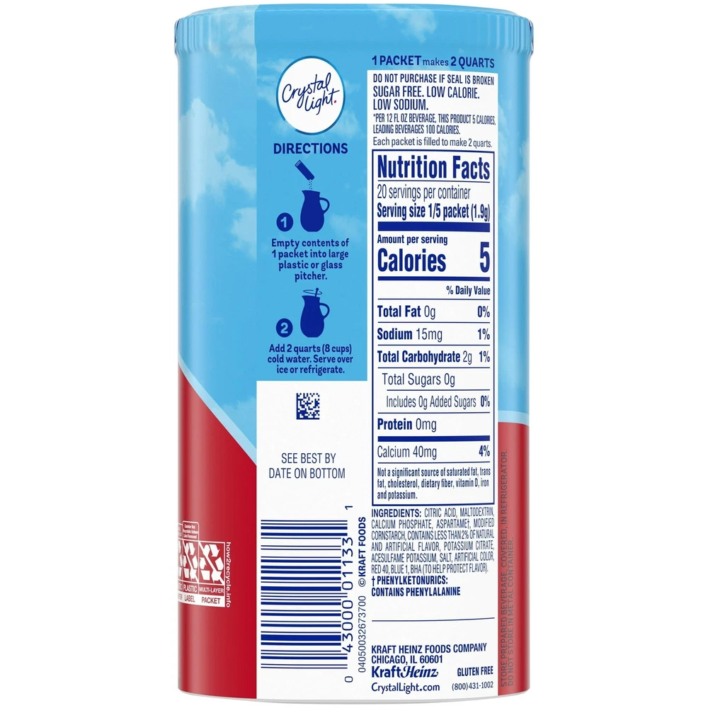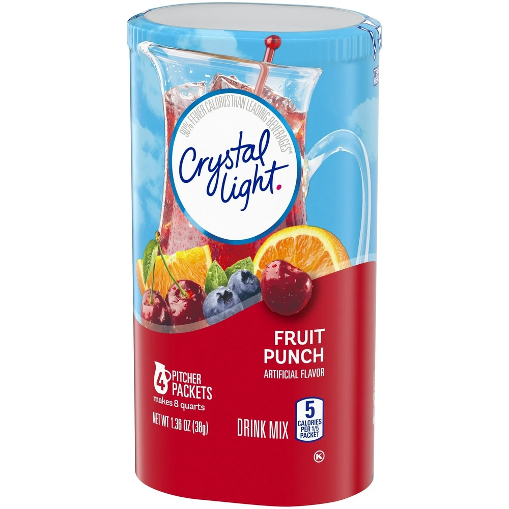 Product Description Crystal Light Fruit Punch Artificially Flavored Low Calories Powdered 4 Pitcher Packet Drink Mix 1.36 Oz (Pack Of 2) It offers a classic fruit punch flavor for a refreshing taste. Each pitcher packet of powdered fruit punch mix in this 4 count canister is perfectly portioned to make 2 quarts or 1 pitcher of Crystal Light, so there's plenty to share with family and friends. Simply mix one packet of fruit punch powder with 8 cups or 2 quarts of water, stir, and enjoy! All the flavor and only 5 calories... just the way you like it. Crystal Light Artificially Flavored Fruit Punch Powdered Drink Mix delivers low calorie refreshment Each pitcher packet makes 5 servings or one 2-quart pitcher Made with zero sugar and 5 calories per serving for guilt-free refreshment Classic fruit punch flavor for a refreshing taste 90 percent fewer calories than leading beverages; this product 5 calories, leading beverages 70 calories Comes in a variety of sizes for all your beverage needs 4 ct. canisters of Crystal Light Artificially Flavored Fruit Punch Powdered Drink Mix Ingredients CITRIC ACID (PROVIDES TARTNESS), MALTODEXTRIN, CALCIUM PHOSPHATE (PREVENTS CAKING), ASPARTAME* (SWEETENER), MODIFIED CORNSTARCH, RED 40, CONTAINS LESS THAN 2% OF NATURAL AND ARTIFICIAL FLAVOR, POTASSIUM CITRATE (CONTROLS ACIDITY), ACESULFAME POTASSIUM (SWEETENER), SALT, ARTIFICIAL COLOR, BLUE 1, BHA (TO HELP PROTECT FLAVOR). *PHENYLKETONURICS: CONTAINS PHENYLALANINE. Nutrition facts Refer to the product label for full dietary information, which may be available as an alternative product image. 32.0 Servings Per Container Serving Size 1.900000 Amount per serving Calories 5 Amount per serving % Daily Value* Total Fat 0g 0% Sodium 10mg 0% Total Carbohydrate 0g 1% Sugars 0g Includes Added Sugars 0g Protein 0g Calcium 40.0mg 4%