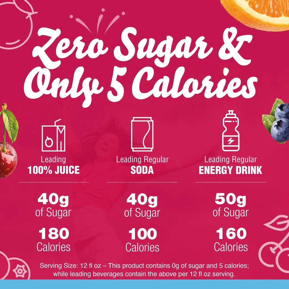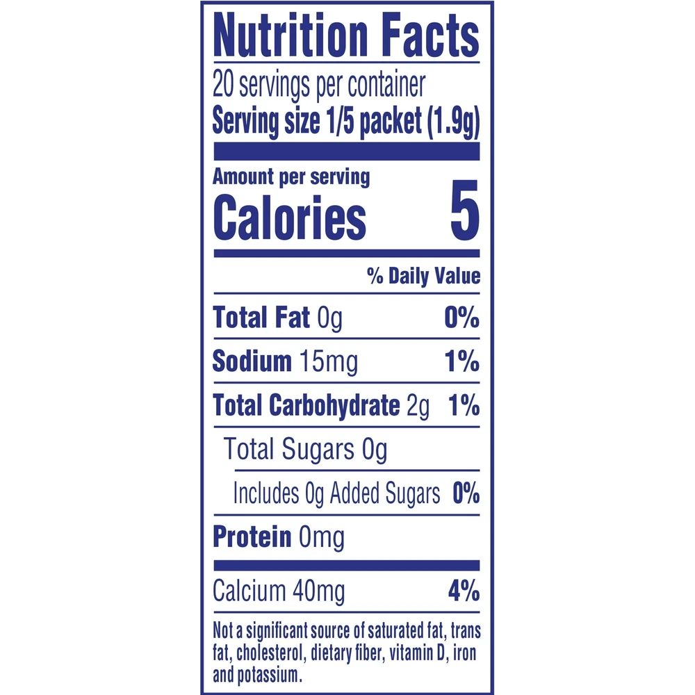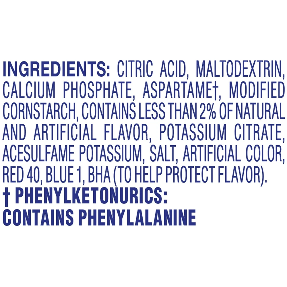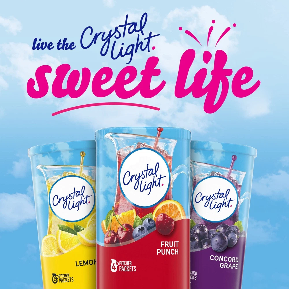 Product Description Crystal Light Fruit Punch Artificially Flavored Low Calories Powdered 4 Pitcher Packet Drink Mix 1.36 Oz (Pack Of 2) It offers a classic fruit punch flavor for a refreshing taste. Each pitcher packet of powdered fruit punch mix in this 4 count canister is perfectly portioned to make 2 quarts or 1 pitcher of Crystal Light, so there's plenty to share with family and friends. Simply mix one packet of fruit punch powder with 8 cups or 2 quarts of water, stir, and enjoy! All the flavor and only 5 calories... just the way you like it. Crystal Light Artificially Flavored Fruit Punch Powdered Drink Mix delivers low calorie refreshment Each pitcher packet makes 5 servings or one 2-quart pitcher Made with zero sugar and 5 calories per serving for guilt-free refreshment Classic fruit punch flavor for a refreshing taste 90 percent fewer calories than leading beverages; this product 5 calories, leading beverages 70 calories Comes in a variety of sizes for all your beverage needs 4 ct. canisters of Crystal Light Artificially Flavored Fruit Punch Powdered Drink Mix Ingredients CITRIC ACID (PROVIDES TARTNESS), MALTODEXTRIN, CALCIUM PHOSPHATE (PREVENTS CAKING), ASPARTAME* (SWEETENER), MODIFIED CORNSTARCH, RED 40, CONTAINS LESS THAN 2% OF NATURAL AND ARTIFICIAL FLAVOR, POTASSIUM CITRATE (CONTROLS ACIDITY), ACESULFAME POTASSIUM (SWEETENER), SALT, ARTIFICIAL COLOR, BLUE 1, BHA (TO HELP PROTECT FLAVOR). *PHENYLKETONURICS: CONTAINS PHENYLALANINE. Nutrition facts Refer to the product label for full dietary information, which may be available as an alternative product image. 32.0 Servings Per Container Serving Size 1.900000 Amount per serving Calories 5 Amount per serving % Daily Value* Total Fat 0g 0% Sodium 10mg 0% Total Carbohydrate 0g 1% Sugars 0g Includes Added Sugars 0g Protein 0g Calcium 40.0mg 4%