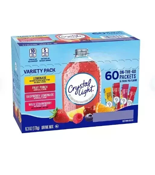 About this item Brand Toozoon Item Form Tablet Package Information Box Special Ingredients sugar flavors Package Weight 0.24 Kilograms A variety pack of 60 Crystal Light Powdered Drink Mix Singles Variety Pack includes 15 packets of each fruity flavor lemonade, fruit punch, raspberry lemonade, wild strawberry To prepare, simply empty one packet into a 16.9 oz. bottle or empty one packet into tall glass and add 2 cups of water and shake or stir to combine ZERO-SUGAR & LOW CALORIE – With each packet of lemonade drink mix containing absolutely zero grams of sugar and only 5 or 10 calories per serving Surprise your loved ones with a gift or just perfect for you Rank (BSR): #