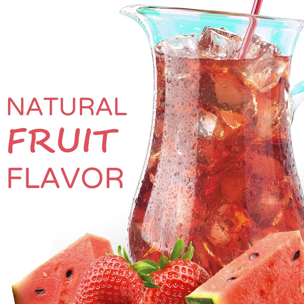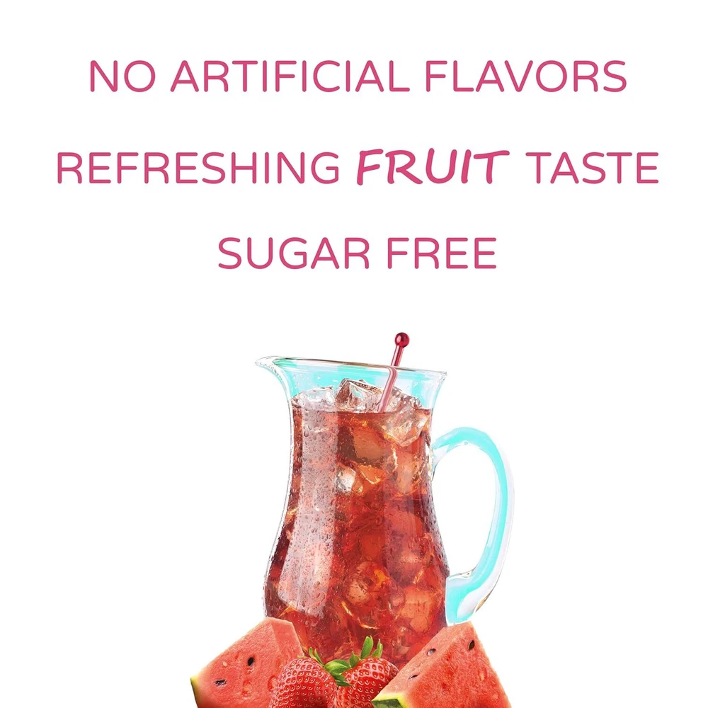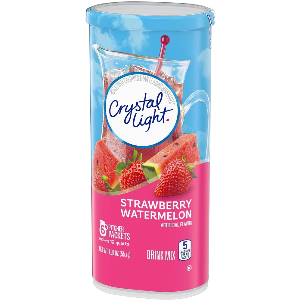 Product Description Crystal Light Strawberry Watermelon Drink Mix, (55.7 G) 12-Quart Canister 1.96 Ounce (Pack Of 2) Crystal Light Artificially Flavored Strawberry Watermelon Powdered Drink Mix is a deliciously fruity beverage you can enjoy at any time of day. With zero grams of sugar and only 5 calories per serving, Crystal Light drink mix is a sweet alternative to juice and soda and has 90 percent fewer calories than leading beverages, 6 ct canister of Crystal Light Artificially Flavored Strawberry Watermelon Powdered Drink Mix Crystal Light Strawberry Watermelon Powder Drink Mix delivers low calorie refreshment Each Crystal Light pitcher pack makes 5 servings or one 2-quart pitcher Crystal Light singles to go drink mix are made with zero sugar and 5 calories per serving for a guilt-free beverage Refreshing fruity flavor 90 percent fewer calories than leading beverages; this product 5 calories, leading beverages 100 calories Comes in a variety of sizes for all your beverage needs Kosher Product and Caffeine Free Low in Sodium and Gluten Free Sugar-free and just 5 calories per serving; Crystal Light has 90% fewer calories than leading beverages Gluten-free; Kosher-certified Ingredients Citric Acid, Maltodextrin, +Aspartame, ++Corn Syrup Solids, Contains Less Than 2% of Natural and Artificial Flavor, Acesulfame Potassium, Sodium Citrate, Magnesium Oxide, Red 40. +Phenylketonurics: Contains Phenylalanine ++Adds A Trivial Amount of Sugar Nutrition facts Refer to the product label for full dietary information, which may be available as an alternative product image. 30.0 Servings Per Container Serving Size 1/5 packet (2g) Amount per serving Calories 5 Amount per serving % Daily Value* Total Fat 0g 0% Sodium 5mg 0% Total Carbohydrate 2g 1% Sugars 0g Includes Added Sugars 0g Protein 0g