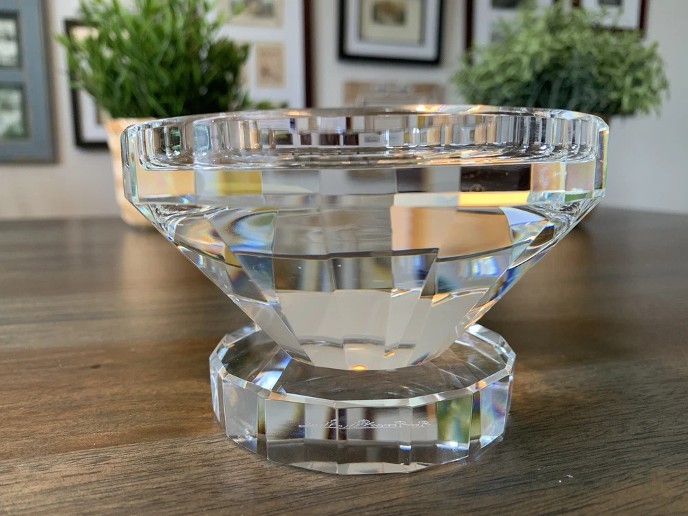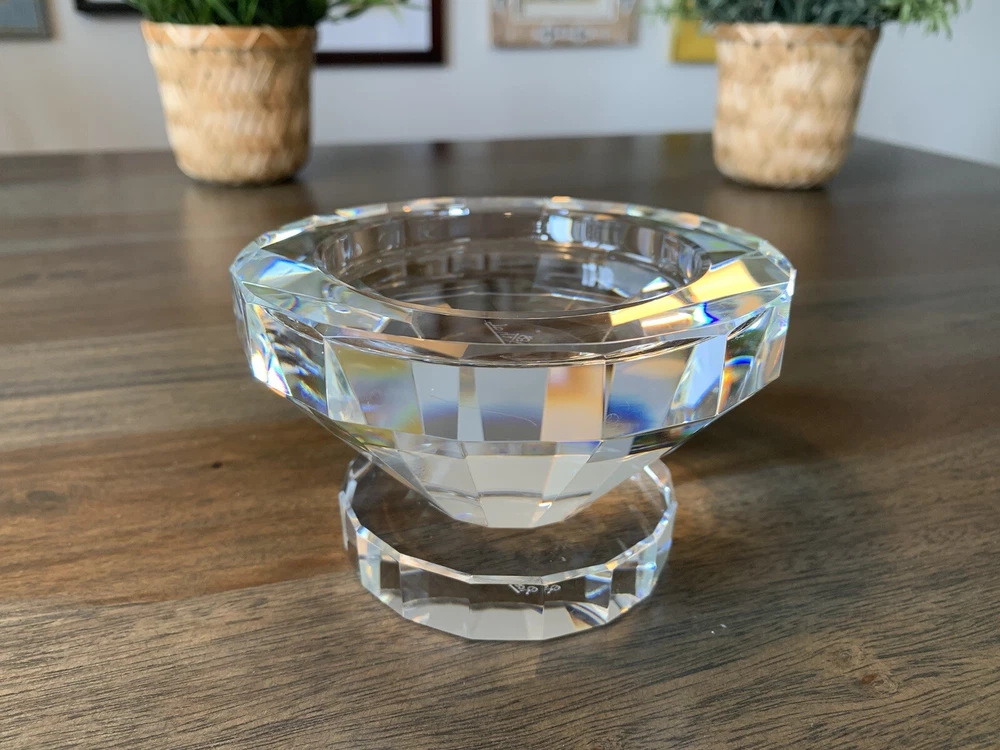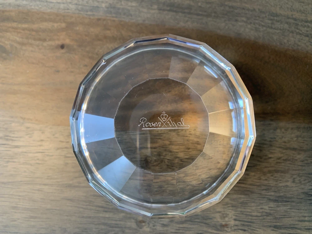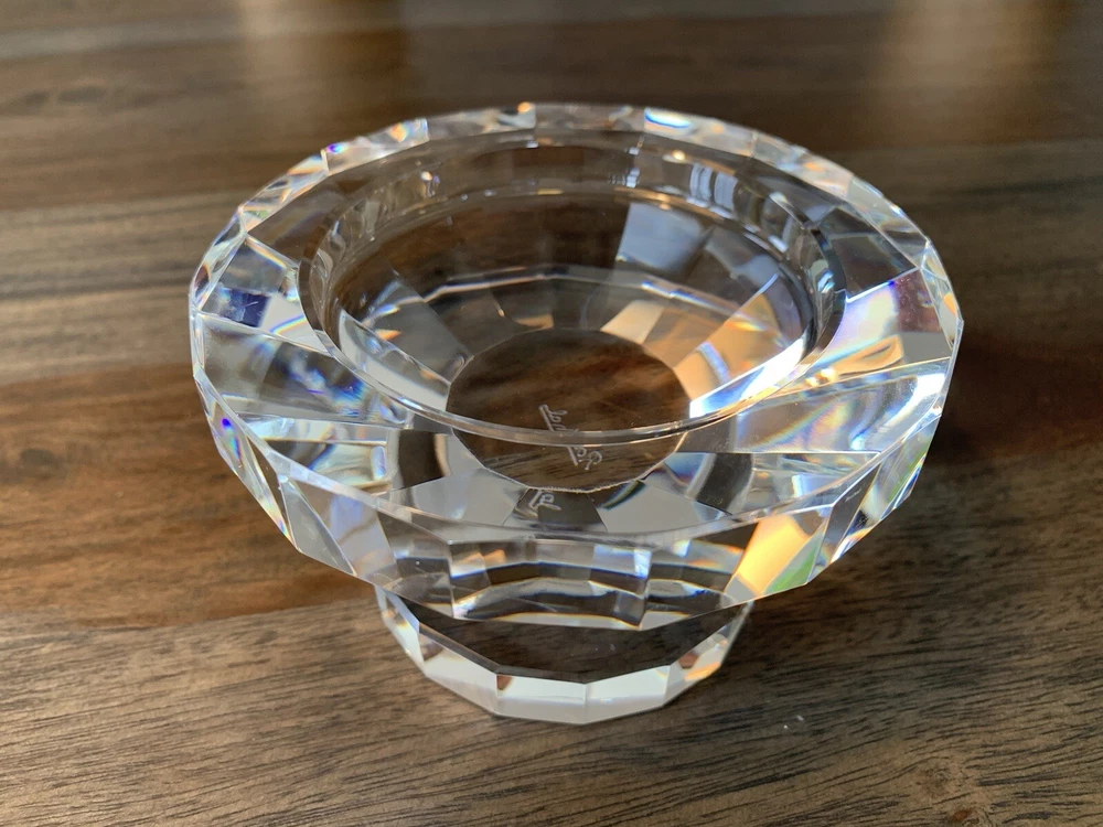 Stunning crystal candle holder by Rosenthal. It is multi-faceted and reflects light strikingly. Made in Germany. A timeless classic, can’t go wrong with this one. It is in good condition with wear consistent with its age and normal use. It has a few scratches on the surface as well as tiny Nick/chips. Please look carefully at the pictures, they’re part of the description. Measurements: - Length: 11.5 cm - height: 7.3 cm - width: 11.5 cm - weight: 1.064 kg