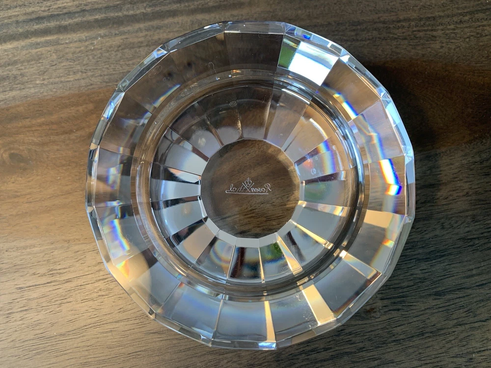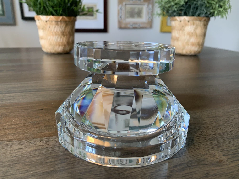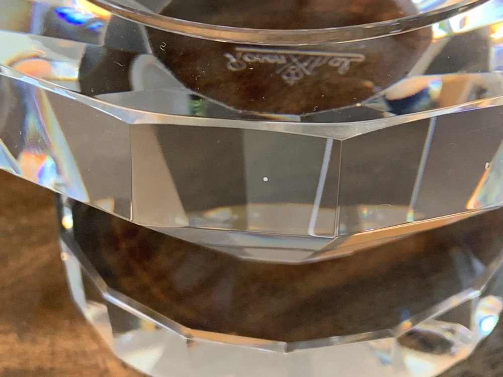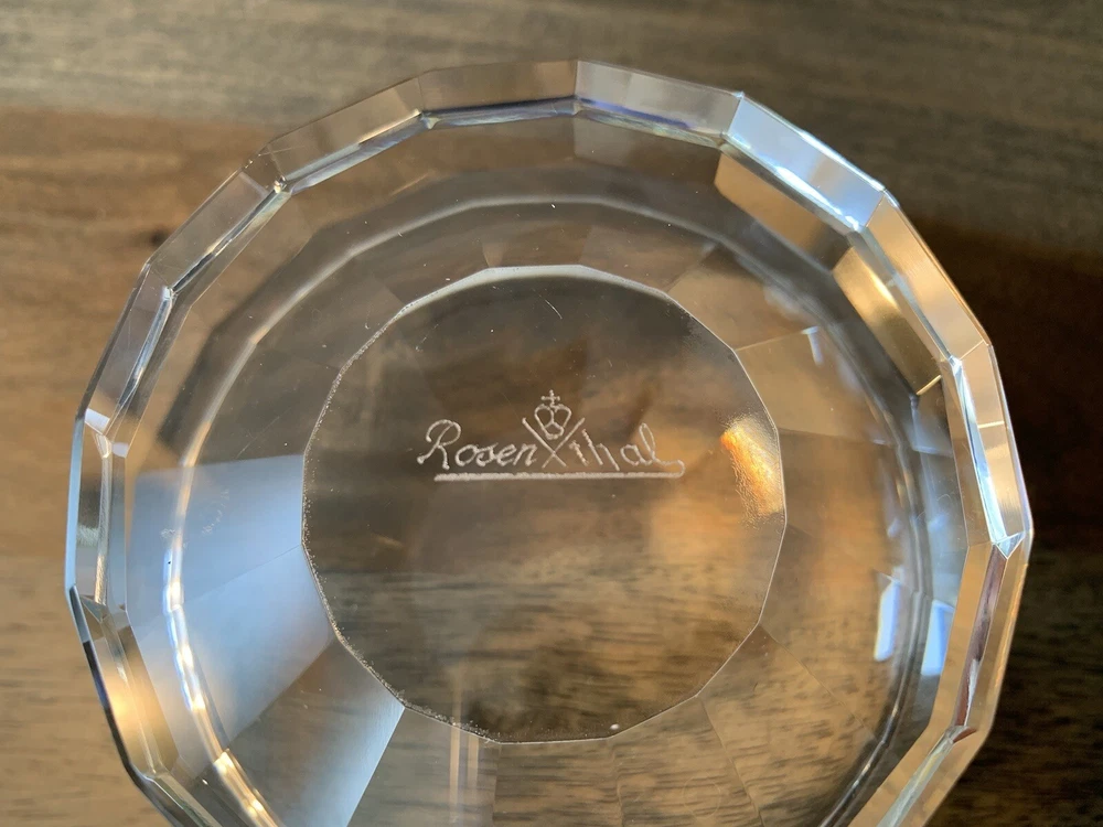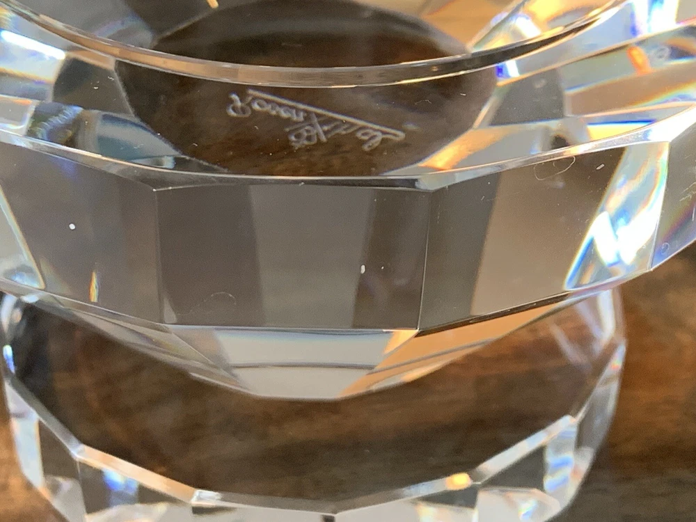 Stunning crystal candle holder by Rosenthal. It is multi-faceted and reflects light strikingly. Made in Germany. A timeless classic, can’t go wrong with this one. It is in good condition with wear consistent with its age and normal use. It has a few scratches on the surface as well as tiny Nick/chips. Please look carefully at the pictures, they’re part of the description. Measurements: - Length: 11.5 cm - height: 7.3 cm - width: 11.5 cm - weight: 1.064 kg