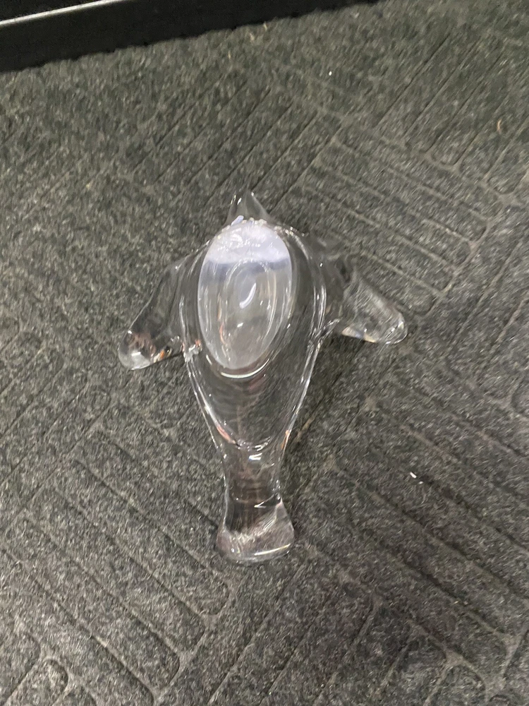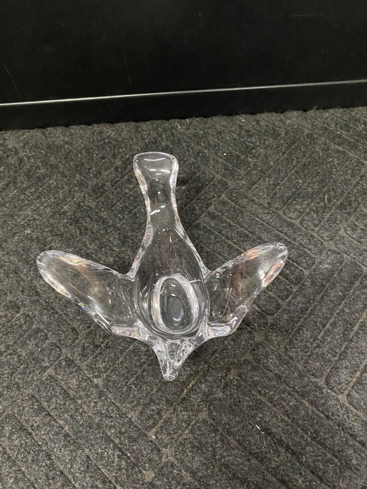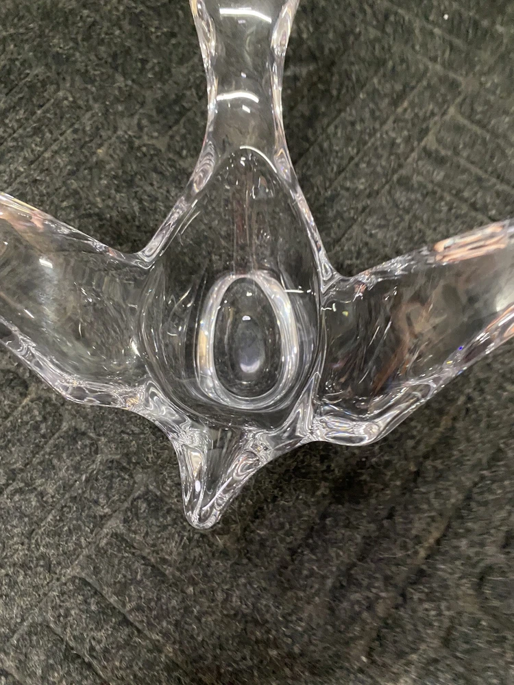 This clear crystal soaring bird has multiple uses. It is heavy and could be used as a paperweight or desk decor. It is open in the center making it perfect for a candy/nut dish. It is in very good condition with no chips or cracks. You get the actual item pictured so please look at all photos and ask any questions before purchase.