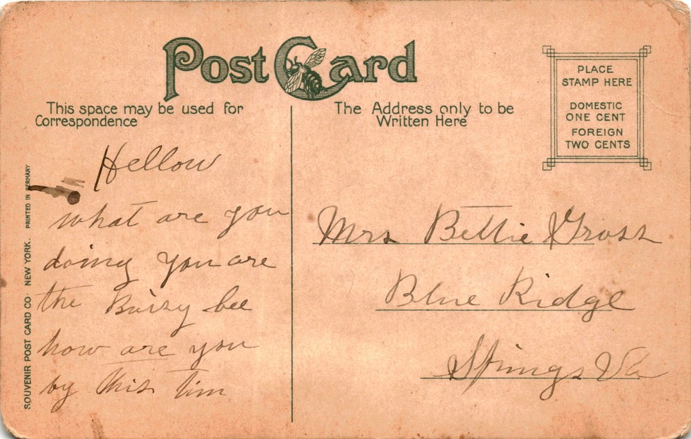 MAKE AN OFFER. THE MORE YOU BUY THE BETTER DEAL I WILL ACCEPT The postcard is from Crystal Springs in Roanoke, Virginia, printed in Germany. The message on the postcard is informal, asking what are you Mrs. Bettie Gross doing you are the Bairy Burzy bee how are are you by this time. The postmark on the postcard is from Blue Ridge, Virginia, dated Ming. 22.