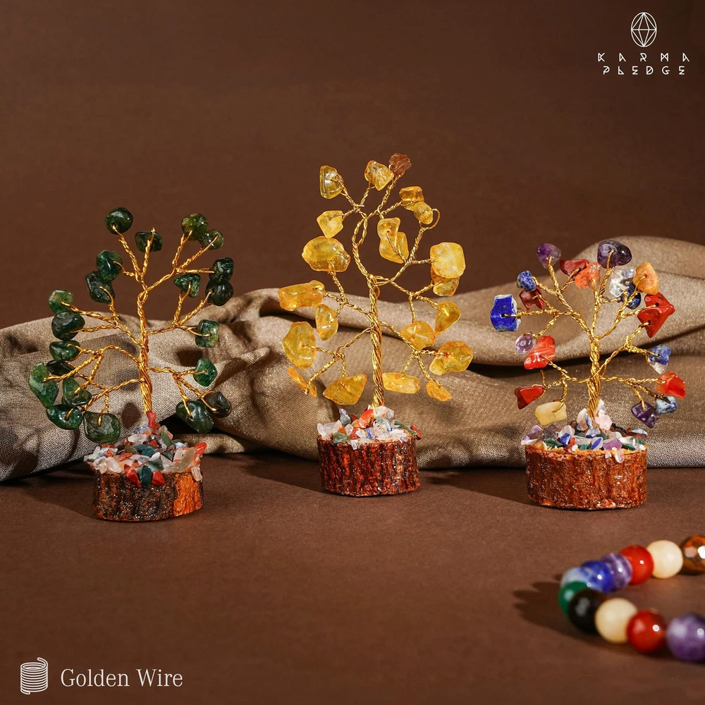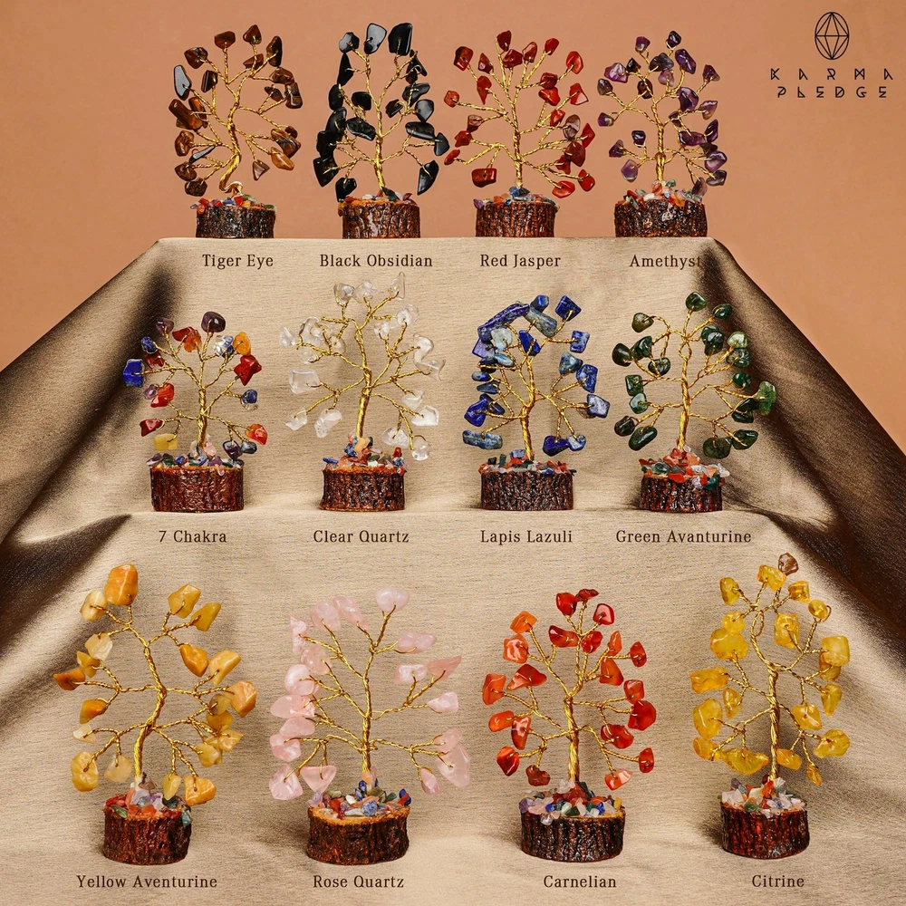 TREES SPECIFICATIONS: These stunning crystal trees are a perfect addition to any space. Measuring between 2 to 2.7 Inches in height and weighing around 1.05 to 1.7 ounces, each tree features approximately 21 natural crystal beads. As each crystal is naturally formed, there may be slight variations in size, color, texture, and other qualities, making every tree unique. Keep this away from liquid or moist surfaces. SPIRITUAL BALANCE: The 7 chakra crystal tree represents the Root Chakra (Red Jasper), Sacral Chakra (Carnelian), Solar Plexus Chakra (Citrine), Heart Chakra (Green Aventurine), Throat Chakra (Lapis Lazuli), Third Eye Chakra (Amethyst), and Crown Chakra (Clear Quartz). These stones are associated with positiveness and can bring luck, wealth, and prosperity. TREE OF LIFE: Elevate the ambiance of your home or office with our set of 12 mini wooden base healing crystal trees. Crafted to infuse spaces with positivity, these exquisite pieces not only beautify surroundings but also promote harmony and balance. A must-have for those seeking a unique and uplifting decor accent. GOOD LUCK GIFT: Searching for a meaningful and distinctive gift? Look no further than this exquisite crystal tree, designed to bring positive energy into any space. Whether used for meditation or admired for its beauty, this gift is a heartfelt gesture to express your care. Share the gift of positivity and good vibes with this stunning crystal tree today ITEM CONTENTS: These little crystal trees are enclosed in the box itself. Alongside, you'll find a note detailing information about the crystal tree and its unique properties. To ensure safe packing, all tree branches be folded and securely packed. Upon receiving, you'll need to arrange the branches and leaves with creativity and patience, allowing you to personalize your crystal tree display. This is an all-season product for your space.