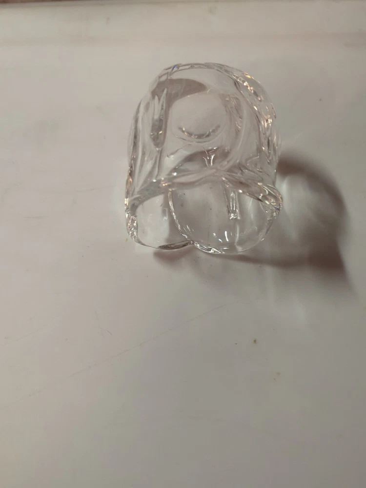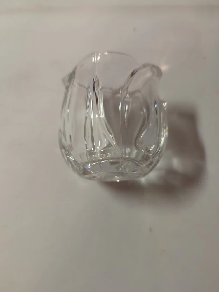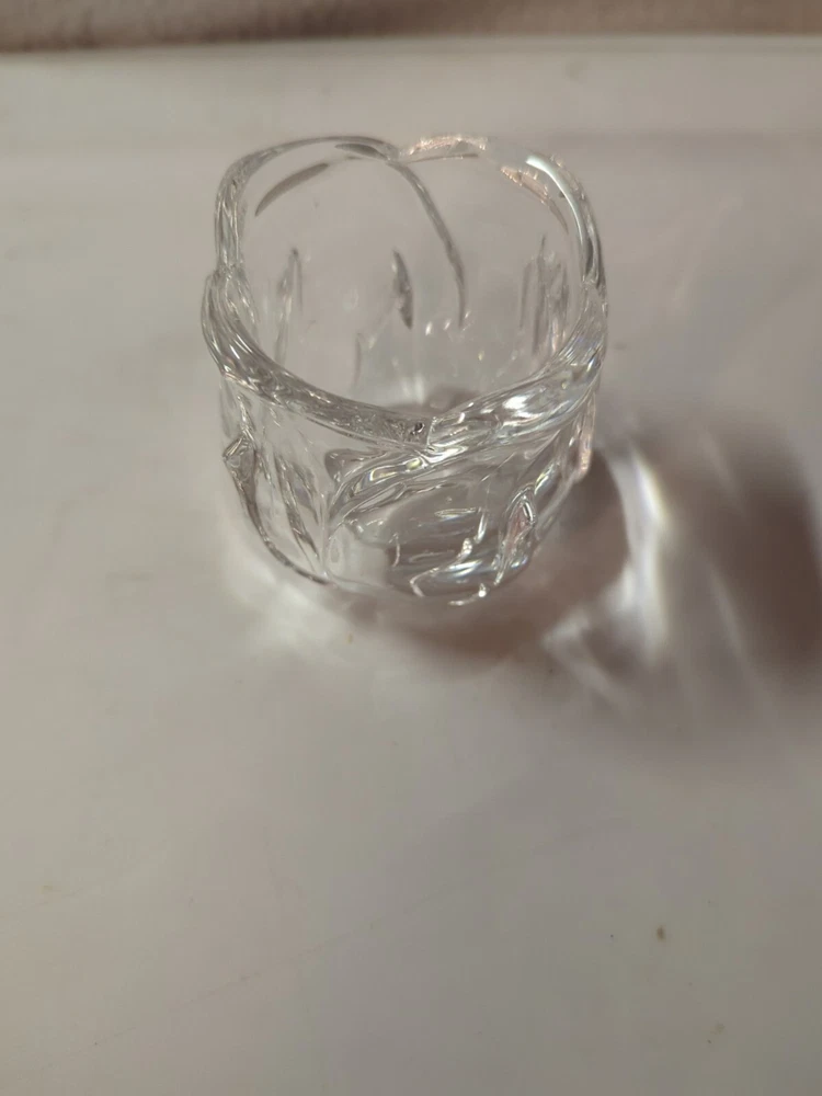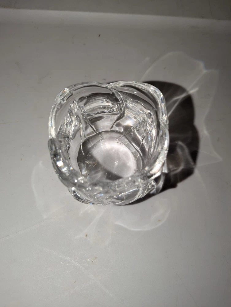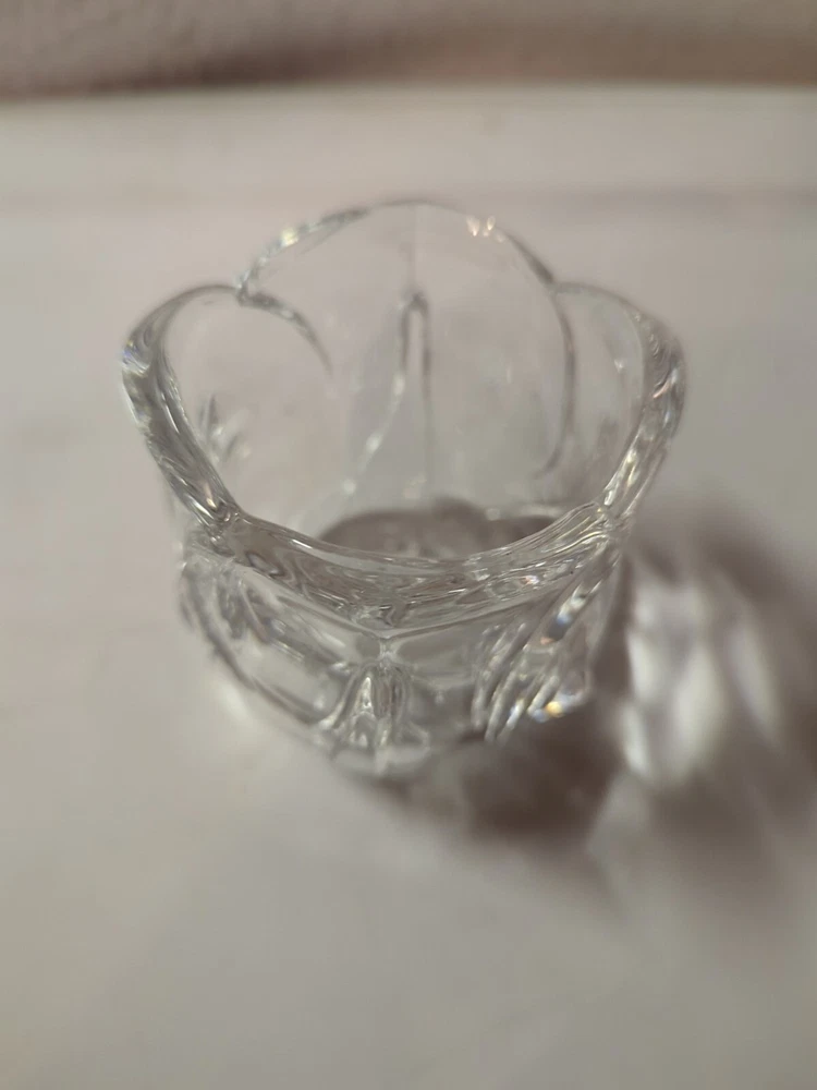 This product is a small, clear glass candle holder shaped like a flower with crystal accents. It is suitable for votive candles and is contemporary in style. The holder is 3 inches tall and 2-3/4 inches wide, and it features a glossy finish.