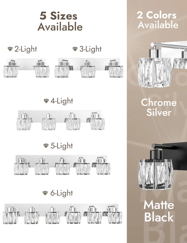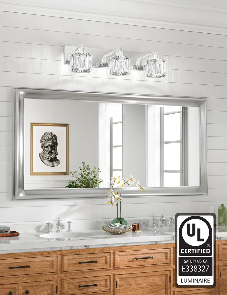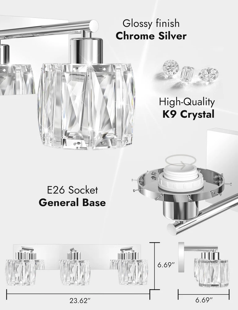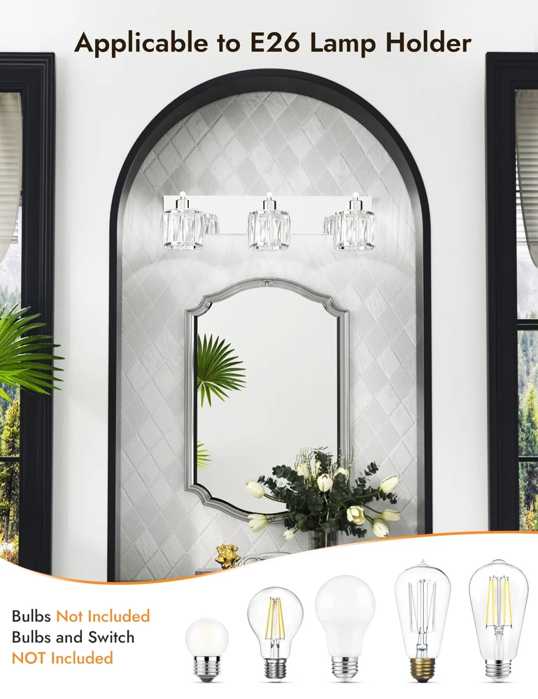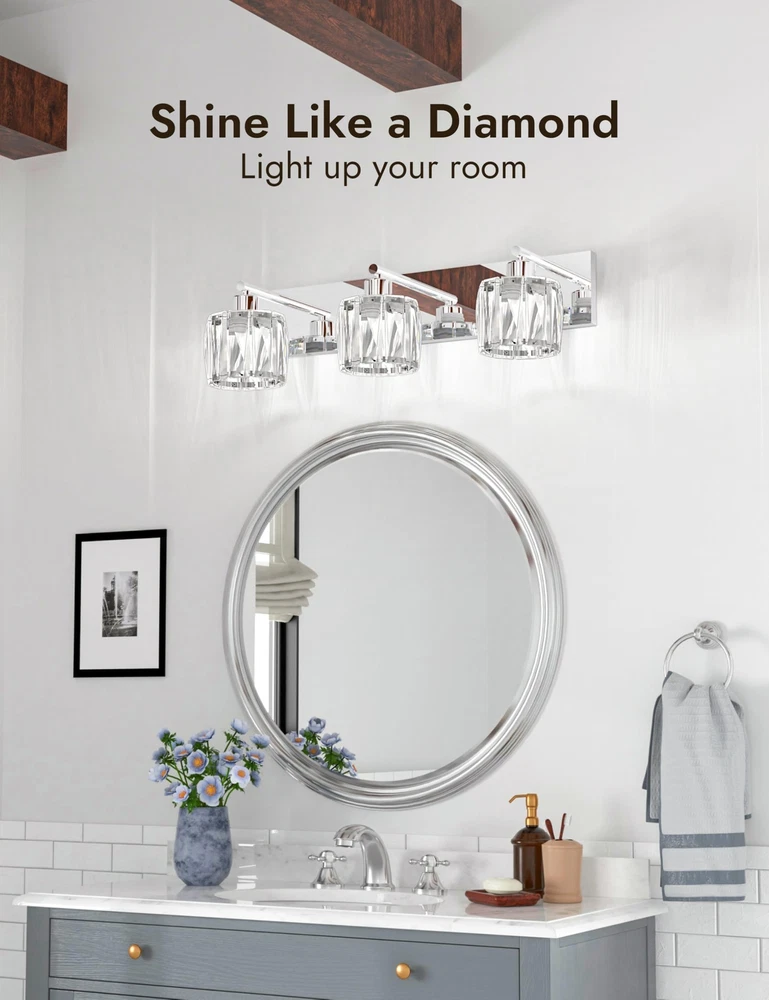 【GORGEOUS CRYSTAL - GLASS LAMPSHADE】The 3 light bathroom vanity light with its glass lampshade can create a bright and gentle atmosphere. The light it emits is highly eye - friendly, making it an ideal choice for the whole family. Additionally, bathroom vanity light is a perfect option for decorating the bathrooms in your home. 【LIGHT SOURCE】: Vanity light fixture features an E26 US Standard Socket. With a maximum power of 60W, vanity lighting fixtures is compatible with any LED, halogen, incandescent, or energy - saving bulb with an E26 base. (Note: Bulbs are not included.) 【HIGH QUALITY】:The chrome vanity light's body is made of high - quality stainless steel, which is smooth like a mirror, resistant to rust, fading, and corrosion. The crystal vanity light has premium transparent crystal lampshades, providing bright and romantic light. 【EASY TO INSTALL】: The bathroom lighting fixtures over mirror comes with a US standard installation back plate, allowing for effortless mounting onto the electric box. You can simply connect it directly to the bathroom lighting fixture is UL - listed, ensuring safety. 【100% SATISFACTION SERVICE】: We proudly stand behind all of our products 100% and offer a full 2-year service for our modern vanity lights. This will cover you if the bathroom lights stop working or there are any defects within those 2 years.