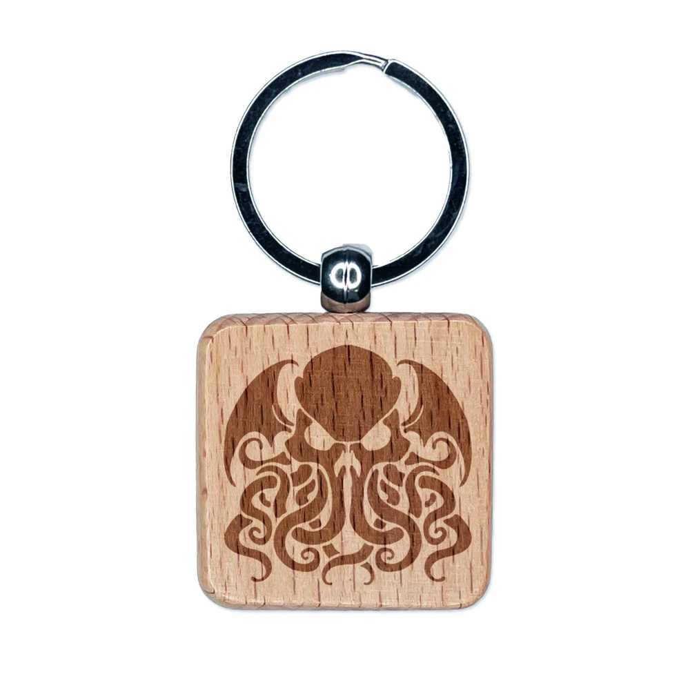 Cthulhu Eldritch Horror Engraved Wood Square Keychain Tag Charm