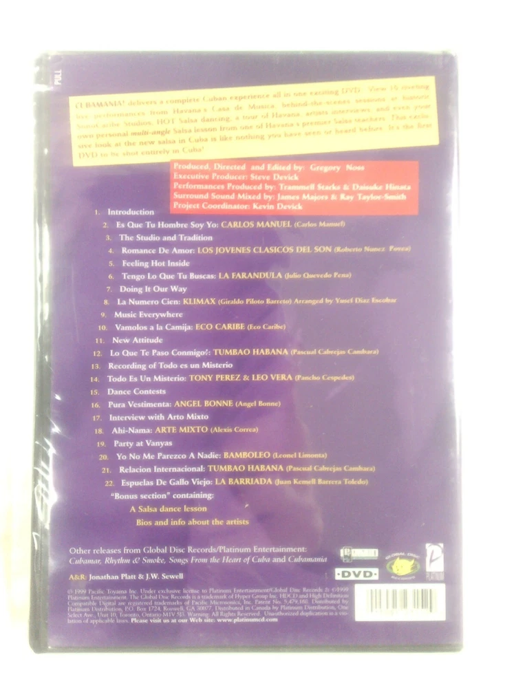 Region Code: DVD: 1 (US, Canada...) CD Grading: Very Good Inlay Condition: Very Good UPC: 0015095231529 gtin13: 0015095231529 Format: DVD Case Condition: Very Good Release Year: 1999 Type: FixedPrice Movie/TV Title: Cubamania! Sub-Genre: Pop Music Rating: NR Genre: Musical & Performing Arts