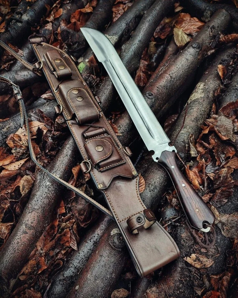 • Dimension Details - OVERALL 22" BOWIE MACHETE KNIFE. Overall, this Durable 440C Steel, Bowie Hunting Knife with Sheath is a handy short-range tool, which is an Ideal gift for your friends and family. • A Perfect Adventure and Outdoor Companion -The Sharp Hand Forged Traditional Bowie Knife is the ideal outdoor companion for any adventure, and it comes with a Superior Durable Sheath. This solid Heavy-duty blade will be your go-to for any activity, whether you're a hunter, hiker, camper, or outdoor enthusiast. • Top-Notch Quality –440C STEEL is used to forge this Fixed Blade Knife Hunting Bowie Knife, which is made to be both aesthetically pleasing and extremely durable. Blade attached to a lovely Rosewood handle that gives you the ideal, firm grip. A sleek, high-end leather sheath is included with the machete. It is durable and thick enough that you won't have to worry about the sharp blade slicing it every time you take out and restore the blade. • Top-notch Craftmanship of The BLADESMITH MATERS MAKING THEM FOR DECADES-The top hand-forged this 16-inch Fixed Blade Handy Bowie knife. The success of the BOWIE is Made by High Skilled Manufacturers," who have been forging knives for many generations with passed-down knowledge, craftsmanship, and born talents. Wedding gift Father's Day gift Mother's Day gift Birthday Gift Groomsmen gift Christmas gift Luxury Gifts For Men Veteran Day Gift Anniversary gift for husband Thanksgiving Gift Christmas Gift Independence Day Groomsmen Gifts Turkey Cutting Processing this handmade forest knife comes with a beautiful leather sheath and back sling. The knife is crafted from high-quality carbon steel using blacksmith technique. If you're looking for an easy-to-use and durable knife, this is perfect for you!" Please read the description thoroughly before placing an order. By doing so, you will understand what we offer and create a more satisfying order, ensuring that neither party ends up disappointed I make our product entirely by hand. I use a hot iron forging method in the knit. Since it is handcrafted, it is not like a factory-made product. Each product contains slight variations from the others. One of the primary distinctions that sets handcrafted products apart from factory-made products are the small traces of hand errors that may appear on the item. This reflects the human nature of imperfection. Wanting both a handcrafted product and a flawless factory-made product is a contradiction in itself. Our product is as durable as it is somewhat heavy.