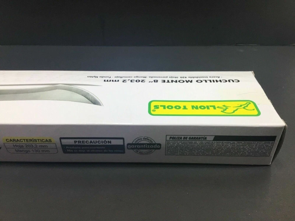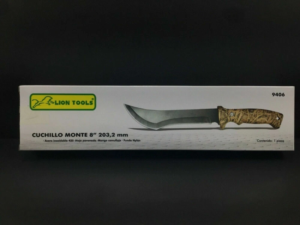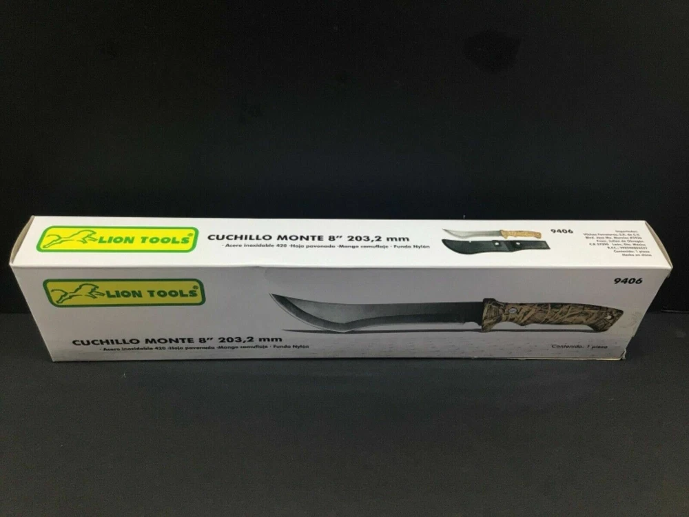 Cuchillo Monte 8” Knife w/ Nylon Sheath & Original Box 9406 By Lion Tools New Due to multiple quantity. Item might look slightly different from pictures. Box has very few minor damage. Will ship in a sturdy uline box. We normally ship within 1 day or same day. We may have 2 days handling time in case of emergencies. But 1 day or same day is our normal shipping time. We also do combined shipping
