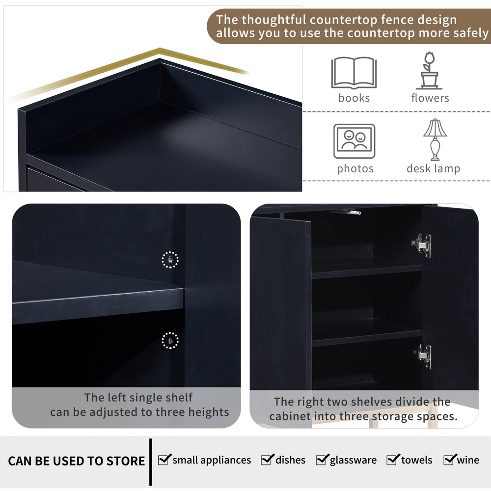 Buffet Cabinet with Storage: Modern Buffet sideabord cabinet features spaious storage capacity.Buffet storage cabinet includes 2 cabinets with 4 doors.The internal three shelves provide enough storage space, the left single shelf can be adjusted to three heights as well or users can remove it if need. And the right two shelves divide the cabinet into three storage spaces. Sturdy Storage Cabinet: The kitchen storage cabinet is crafted from high-quality particle board and steel pipe support base create a firm structure. waterproof, smooth and durable, the countertop load-bearing 75LBS, the shelf load bearing 25LBS. Pop-Up Doors: The unique feature of this cabinet is that there is no regular door handle. This sideboard buffet does not have a door handle, it can be opened by pressing the middle part of the door through the rebound device of the door, which offers you great convenience and an excellent modern experience. Quality Material: Modern Sideboard Buffet Cabinet is mainly made of thick Particle board, The base is made of metal create a firm buffet structure, which ensure stability, and at the same time increase the sensory impact. Perfect for living room, kitchen, dining room, entertainment center, entryway, foyer or hallway Sideboard Buffet Dimension and Assemble: Whole Sideboard Dimensions: 47.2”Lx11.8”Wx31.5”H; Cabinet Interior Dimensions: 22.6”L x 10.6”W x 19.9”H. Easy to assemble sideboard table with tools and clear instrcution included