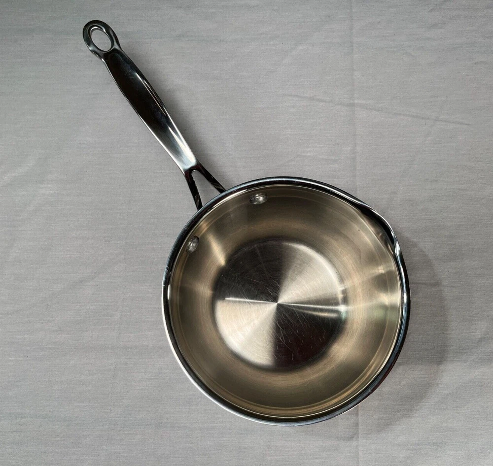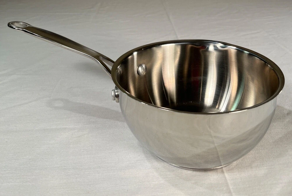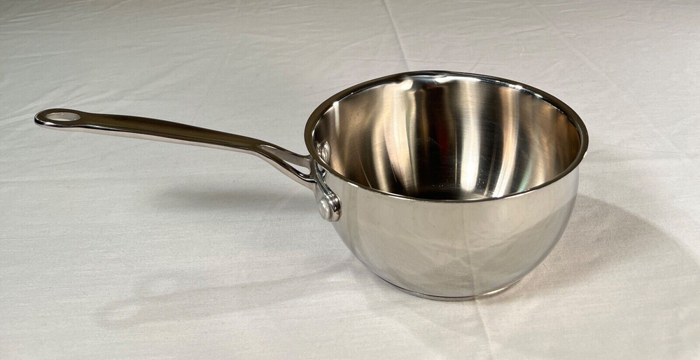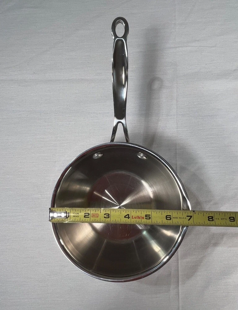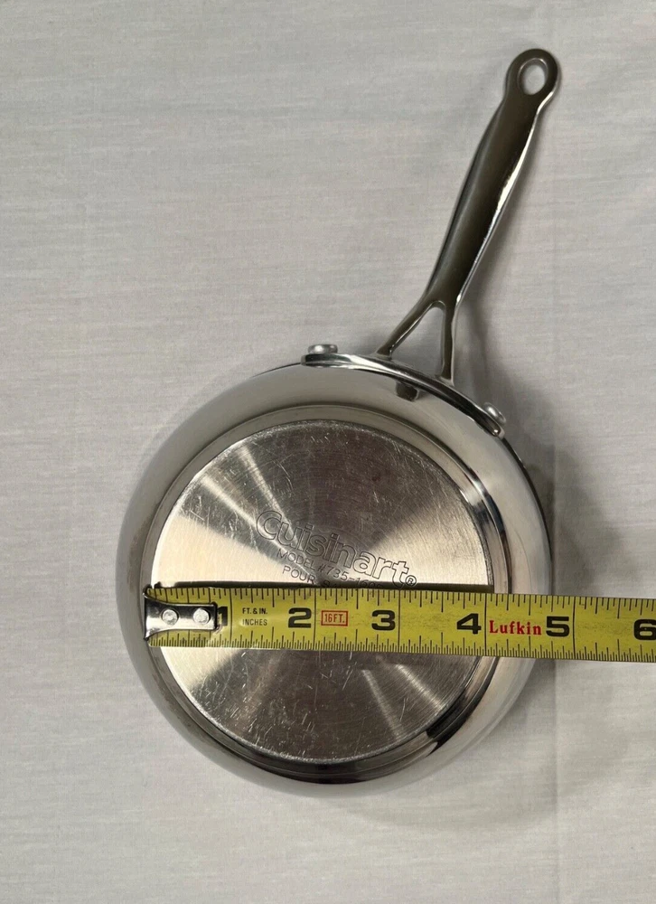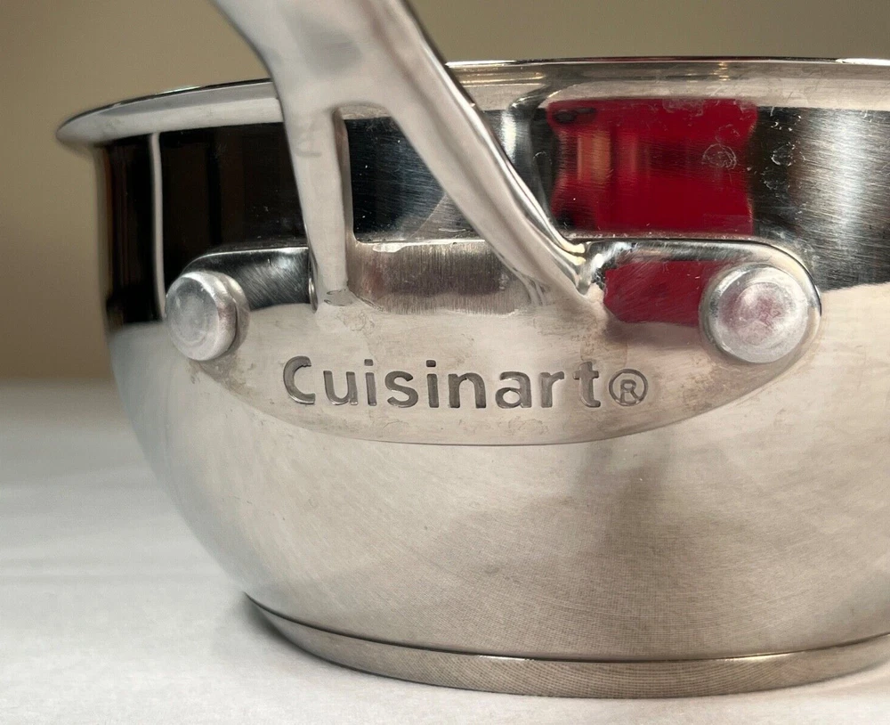 Cuisinart Pour Saucier Model #735-160P, 1 Qt / .95 L Stainless Steel Pot / Pan. This sauce pain is in good condition with minimal wear. Please review the pictures because they provide most of the description and information about condition. Additional information on underside of pan reads: V#17550M 0814 Dimensions: Length: 13 in, including to tip of handle Diameter across the top: 6 3/4 in Diameter across the base: 4 in Height from base to top of pan: 3 1/8 in Height from base to top of tip of handle: 4 1/4 in Weight: 17.8 oz (1.1 lb) No lid included.