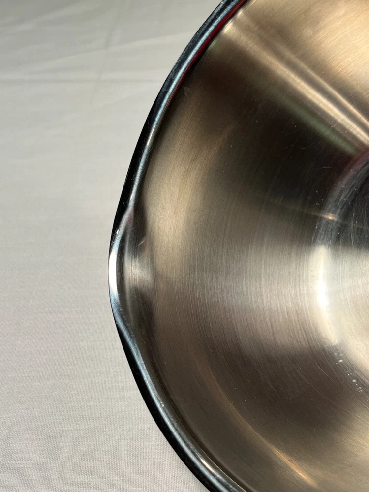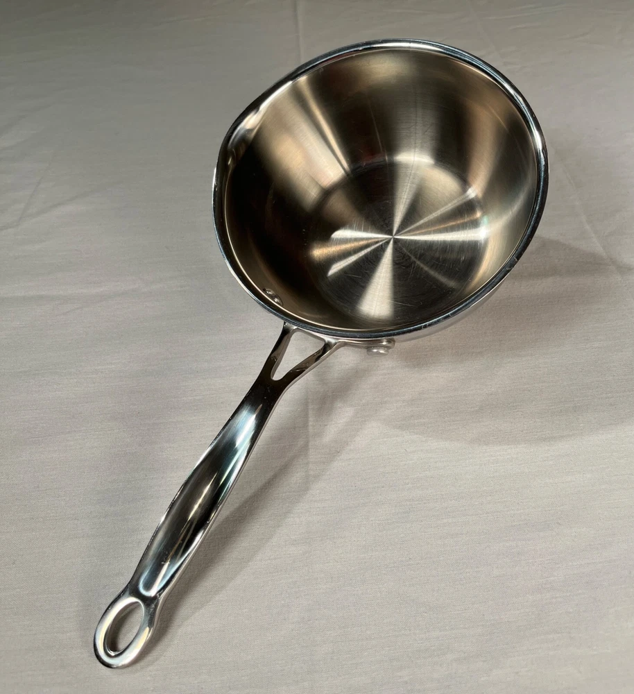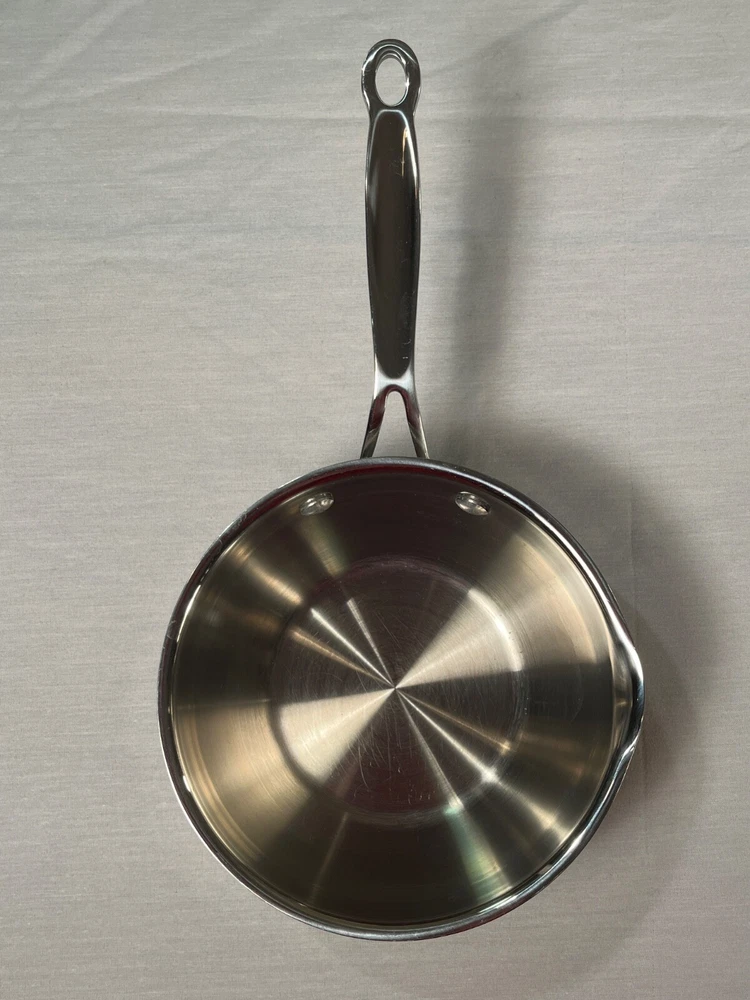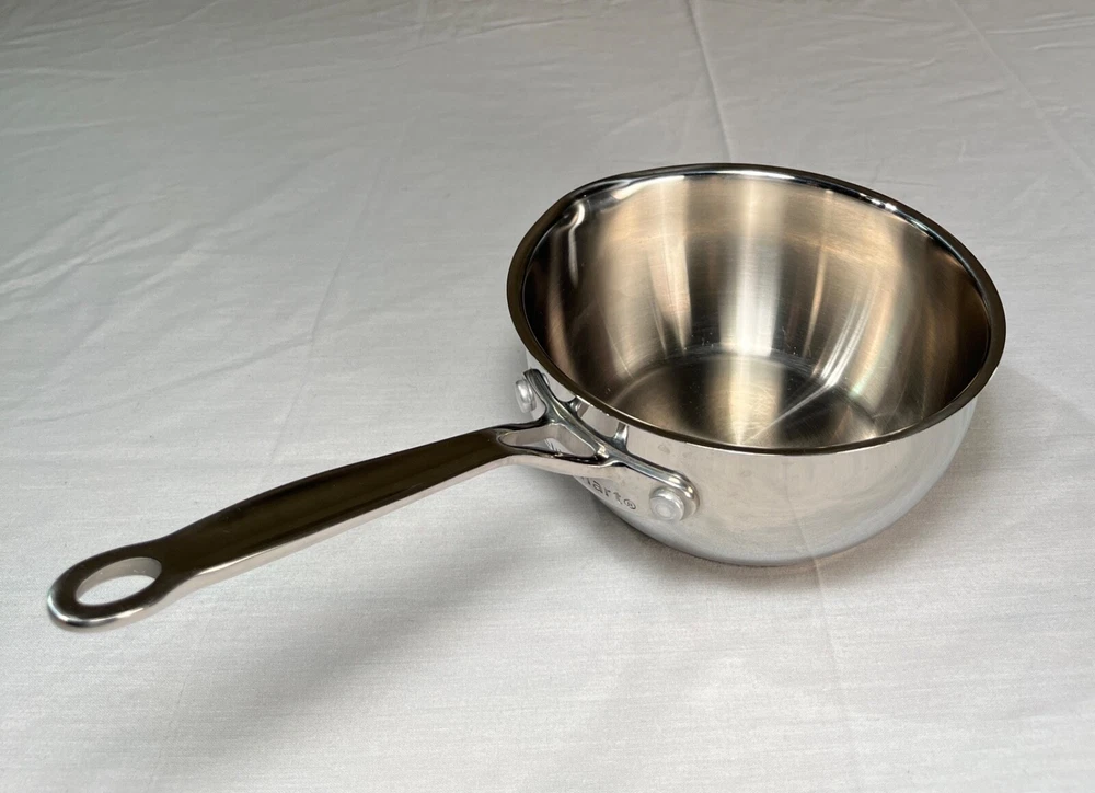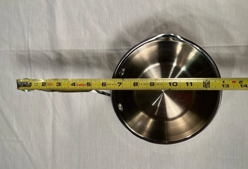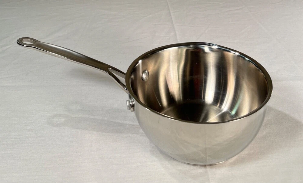 Cuisinart Pour Saucier Model #735-160P, 1 Qt / .95 L Stainless Steel Pot / Pan. This sauce pain is in good condition with minimal wear. Please review the pictures because they provide most of the description and information about condition. Additional information on underside of pan reads: V#17550M 0814 Dimensions: Length: 13 in, including to tip of handle Diameter across the top: 6 3/4 in Diameter across the base: 4 in Height from base to top of pan: 3 1/8 in Height from base to top of tip of handle: 4 1/4 in Weight: 17.8 oz (1.1 lb) No lid included.