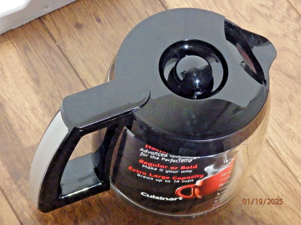 The Cuisinart Coffee Pot Replacement Glass Carafe is designed to hold 14 cups of coffee and comes with a black lid. It is compatible with Cuisinart coffee makers and is a genuine Cuisinart product. The carafe is brand new and does not come in its original packaging. This replacement carafe is perfect for those in need of a new glass carafe for their Cuisinart coffee maker, ensuring they can continue to enjoy freshly brewed coffee at home. The item is in new condition as pictured. I offer fast shipping with prompt payment. Please check out my page for other great items and collectibles!!