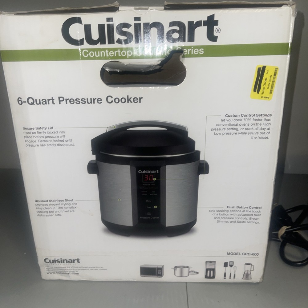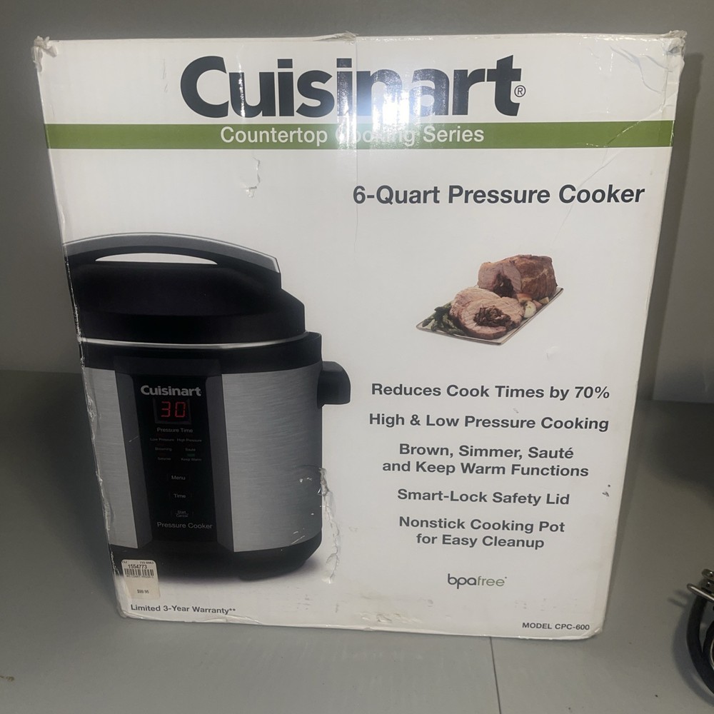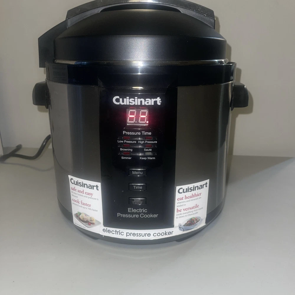 This USED Cuisinart electric pressure cooker is a versatile kitchen appliance that can help you prepare a variety of dishes quickly and efficiently. With a capacity of 6 quarts and a powerful 1000W motor, this cooker can cook food in a matter of minutes. The cooker features a brushed finish and is made of stainless steel, making it durable and easy to clean. It comes with a variety of features, including a timer that can be set up to 99 minutes, a drip tray, and a non-stick, dishwasher-safe pot. The cooker is also BPA-free and has an automatic and programmable mode. Additionally, it is portable, making it easy to take with you on the go. This multi-cooker is perfect for anyone who wants to save time and money on their meals.