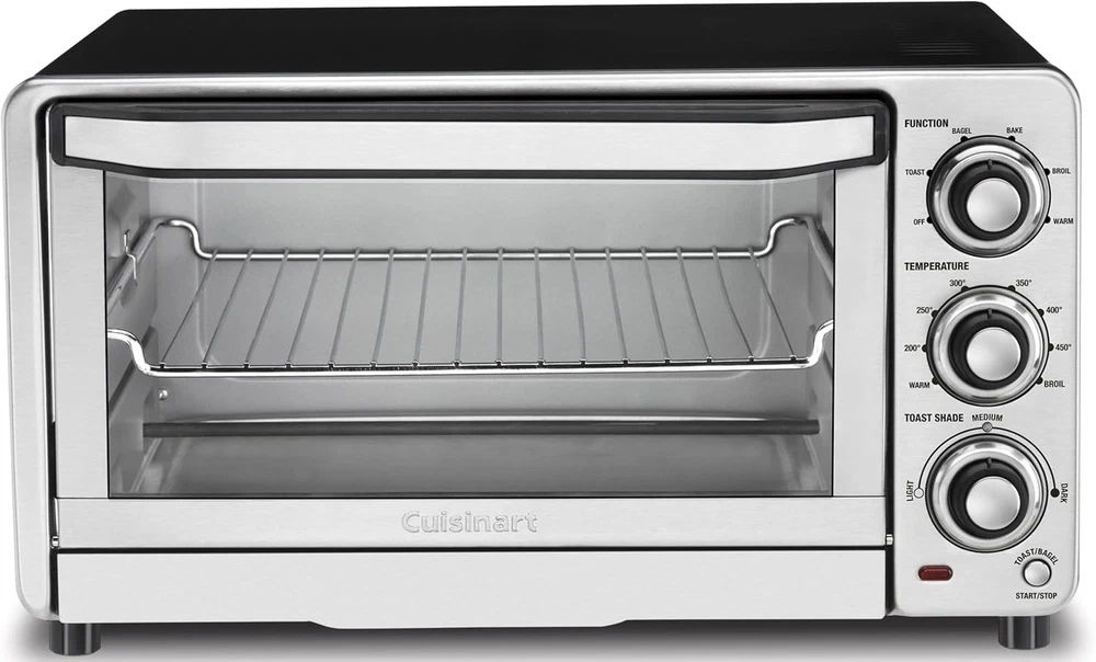 VERSATILE COOKING: Cuisinart Toaster Oven Broiler with 1800 watts of high-performance power offers a wide range of cooking functions in one including toast, bagel, bake, broil, pizza, keep warm, and more. SPACIOUS CAPACITY: Cuisinart oven with 0.5-cubic feet interior lets you toast 6 slices of bread or 4 bagel halves, bake an 11-inch pizza, or roast a family-sized casserole. PERFECT TOAST: Always Even Shade Control monitors the toasting temperature to automatically adjust cooking time for consistent toast results slice after slice. SAFETY & CONVENIENCE: Simple to use, this countertop oven features a cool-touch handle, easy-grip dials, and automatic shutoff for safety, an auto-slide rack to remove cooked food easily, and a non-stick interior for easy cleanup. WHAT’S INCLUDED: Beautiful brushed stainless steel toaster oven comes with a limited 3-year warranty, is BPA free, and includes a wire rack, broiling rack, baking/drip pan, front removable crumb tray with cool-touch grip, and a recipe book. Compact cooking versatility and modern design make this Cuisinart Custom Classic Toaster Oven Broiler an ideal choice for your lifestyle. Boasting 1800 watts of high-performance power, this Cuisinart Toaster Oven Broiler lets you leverage a wide range of cooking functions in one appliance such as toast, bagel, bake, broil, pizza, keep warm, and more. The spacious 0.5-cubic feet interior can toast 6 slices of bread or 4 bagel halves, bake an 11-inch pizza, or roast a family-sized casserole. To ensure consistent results, the Always Even Shade Control monitors the toasting temperature to automatically adjust cooking time for consistent toast results slice after slice. For added convenience, this countertop oven features a cool-touch handle, easy-grip dials, and automatic shutoff for safety, an auto-slide rack to remove cooked food easily, and a non-stick interior for easy cleanup. The brushed stainless steel and black toaster oven broiler includes a wire rack, broiling rack, baking/drip pan, front removable crumb tray with cool-touch grip, and a recipe book. BPA free, the Cuisinart Custom Classic Toaster Oven Broiler TOB-40N comes with a limited 3-year warranty.