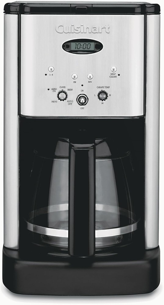 Cuisinart DCC-1200P1 Brew Central 12-Cup Programmable Coffee Maker Carafe About this item FULLY AUTOMATIC COFFEE BREWER: 24-hour programmability with 1–4 cup settings, auto-off functionality (0-4 hours) TEMPERATURE CONTROL: Variable heater plate for temperature control that is adjustable – low, medium, and high settings 12-CUP GLASS CARAFE: Features ergonomic comfort grip black handle, dripless spout, lid, and knuckle guard for added protection DURABLE FILTERS: Permanent gold-tone coffee filter included, and built-in charcoal water filter ensures only the freshest coffee flavor flows through – measuring scoop, #4 paper coffee starter kit and instruction book for best practices and tips included Product Description The Cuisinart brew Central 12 cup programmable coffeemaker makes a bold statement in any kitchen With a brushed metal finish and elegant tech-industrial design. Programmable from start to finish, with a variable heater plate for temperature control, the brew Central 12 cup programmable coffeemaker delivers on every front. With a convenient dripless carafe spout, brew pause feature, and alert for when it is time to decalcify, Cuisinart makes great tasting coffee convenient for your busy lifestyle. Cord storage