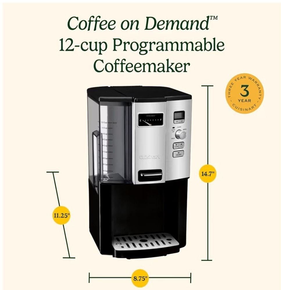 β Fresh coffee anytime at the touch of a lever. Upgrade your kitchen with the Cuisinart Coffee on Demand 12-Cup Programmable Coffeemaker, designed for convenience, performance, and great taste every day. π Condition: BRAND NEW β FACTORY SEALED π¦ Original retail box β never opened, never used. β¨ WHY YOUβLL LOVE IT β Dispenses one cup at a time β no fragile glass carafe β Internal 12-cup reservoir keeps coffee hot and fresh β Fully programmable β wake up to freshly brewed coffee β Removable water tank for quick & easy filling β 1β4 cup setting for small batches β Self-clean function for easy maintenance β Auto shut-off for safety and peace of mind Perfect for home, office, coffee stations, or as a gift π π PRODUCT DETAILS Brand: Cuisinart Model: DCC-3000NAS Capacity: 12 Cups Coffee Type: Ground Coffee Color: Silver / Black Power Source: Electric π¦ WHAT YOUβLL RECEIVE β Brand new unit β Factory sealed retail box β All original components included π SHIPPING β Fast handling β Secure professional packaging β Tracking included Your item will arrive exactly as shown and in perfect condition. π¬ BUY WITH CONFIDENCE Customer satisfaction is my priority. Feel free to message me if you have any questions β I respond quickly!