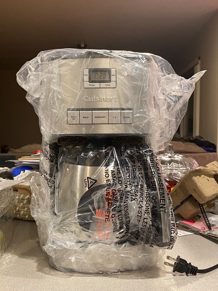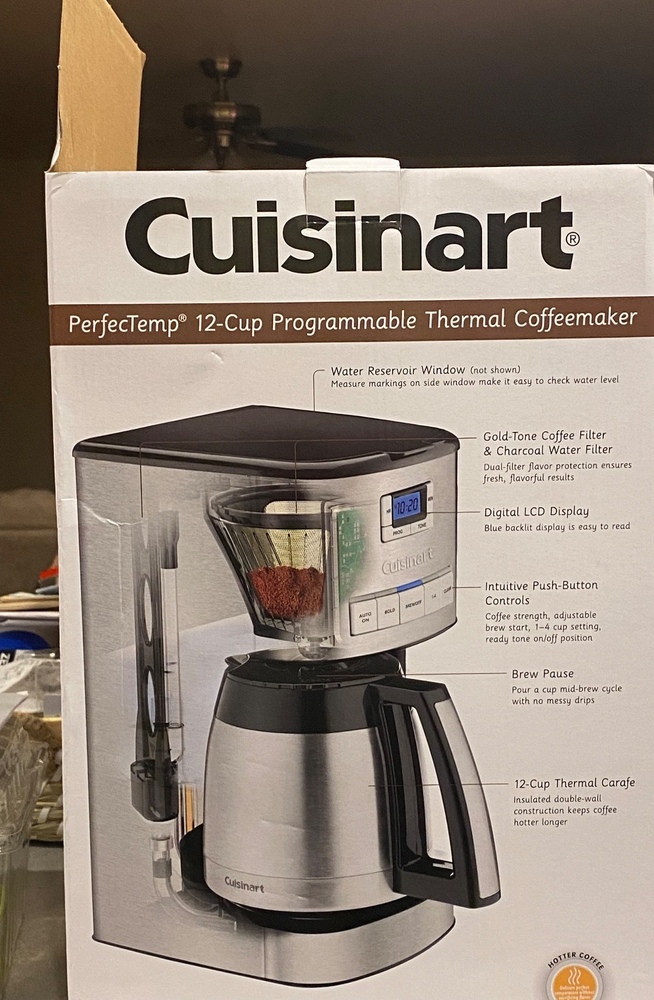 The Cuisinart DCC-3850TG 12-Cup Programmable Thermal Coffeemaker in Silver is a sleek and efficient filter coffee machine that brews up to 12 cups of ground coffee. Made of stainless steel, this coffee maker has a large 60 oz capacity and features like self-cleaning, a water tank, water filter, and a programmable display. Brand new and unused.