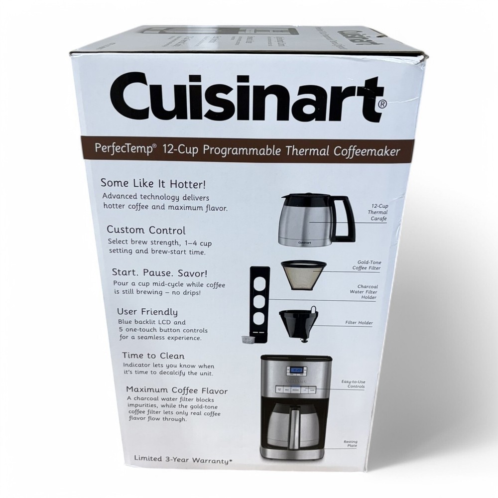 Description With hotter coffee and brew strength options, the Cuisinart 12 Cup Programmable Thermal Coffeemaker is a virtuoso among gourmet coffee makers. Equipped with cutting edge coffee technology to give you hotter coffee without sacrificing taste. Choose a flavor profile with regular or bold strength control, and set brew-time up to 24-hours ahead. Our backlit LCD is easy-to-read, a ready tone can be turned on or off, and an indicator light signals when it’s time to decalcify. Highlights 12 Cup double walled carafe Brew Strength Control, charcoal, and a gold-tone fine filter 60 Second Reset helps recall prior settings and brewing process in case of an electric power outage Automatic -programmable for up to 24-hour cycle Self clean and descale for easy care BPA free 30 inch cord, 1050 watts