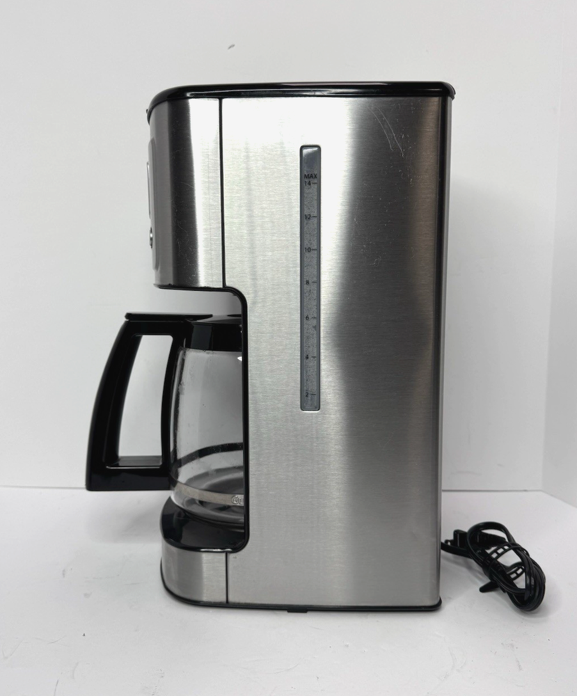 Cuisinart PerfectTemp 14-Cup Programmable Coffee Maker - DCC-3200P1 Minor use. Has marks/scratches. Refer to photos. As shown in generic box. Enjoy Hotter Coffee: Utilize expert coffee-making technology to ensure your coffee temperature is perfect, delivering a delightful taste experience without compromising flavor or quality. Brew Strength Control: Tailor your coffee flavor to perfection by choosing between regular or bold settings, catering to your unique taste preferences with every brew. Fully Automatic Coffee Brewer: Experience convenience with 24-hour program ability, offering flexibility with 1-4 cup settings, auto-off functionality (0-4 hours), and an optional ready alert tone for added convenience. 14-Cup Glass Carafe: Indulge in generous servings of coffee with a sleek glass carafe featuring a decorative stainless-steel handle and matching body, creating a stylish addition to complement your kitchen appliances Fill with Ease: Enjoy accurate water filling through the easy-to-view water window, while Cuisinart's Brew Pause feature allows you to savor a cup of coffee before the brewing cycle completes, enhancing your coffee-drinking experience