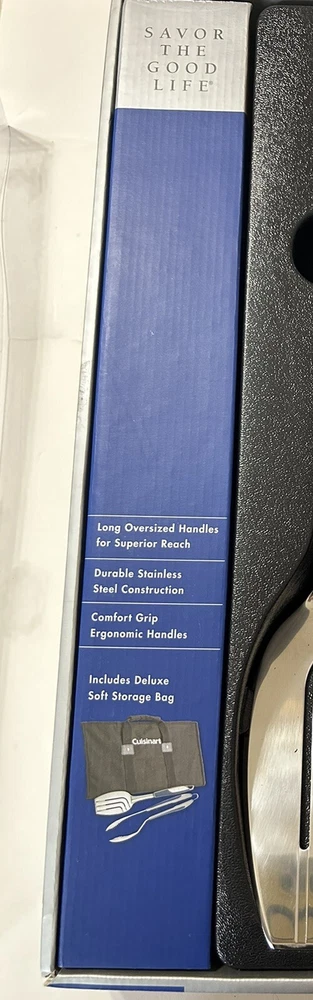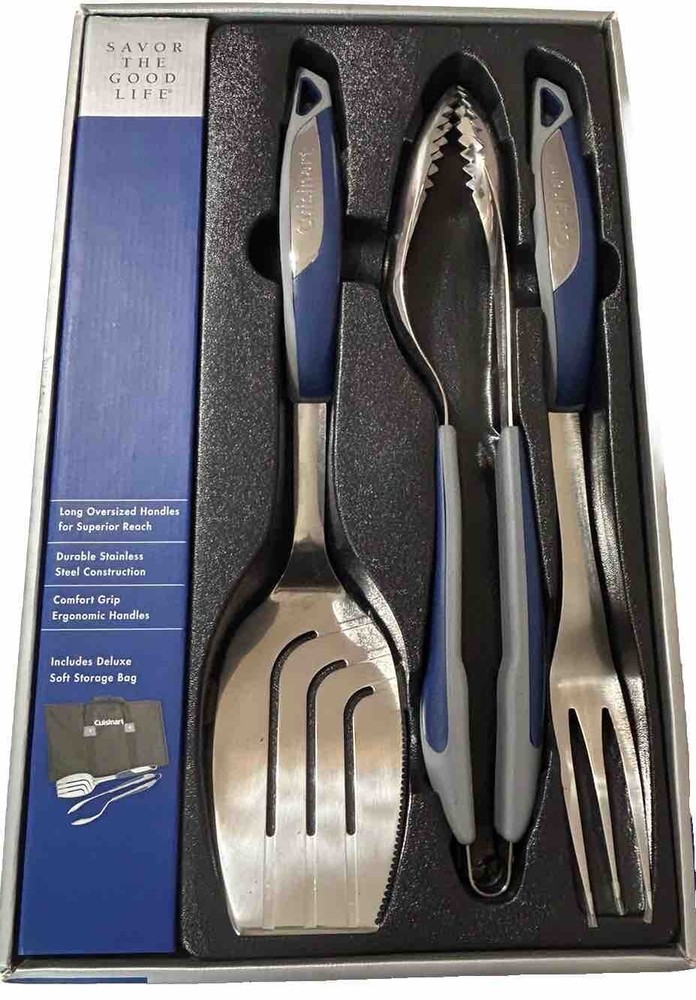 This four-piece gorgeous blue and stainless steel Cuisinart Essential BBQ tool set has everything you need to make your outdoor cooking experience a success. The set includes a specially designed 3 tined barbecue fork, chef’s spatula and professional tongs, all made with stainless steel and ergonomically designed with heat-resistant handles for your comfort. It also includes a black storage bag for the tools. This set is new in an open box from 2009. (I opened the box myself to take the photos.) There is an unused $20 rebate form on the back which is expired so I covered it with paper for the photos. The $20 rebate is NOT valid and cannot be used. Please see photos for details of these beautiful tools and please let me know if you have any questions. I use recycled materials in shipping whenever possible. Measurements are approximate. Non smoking home.