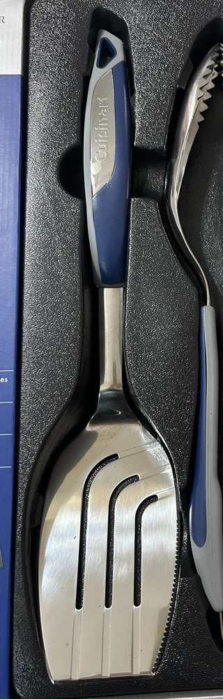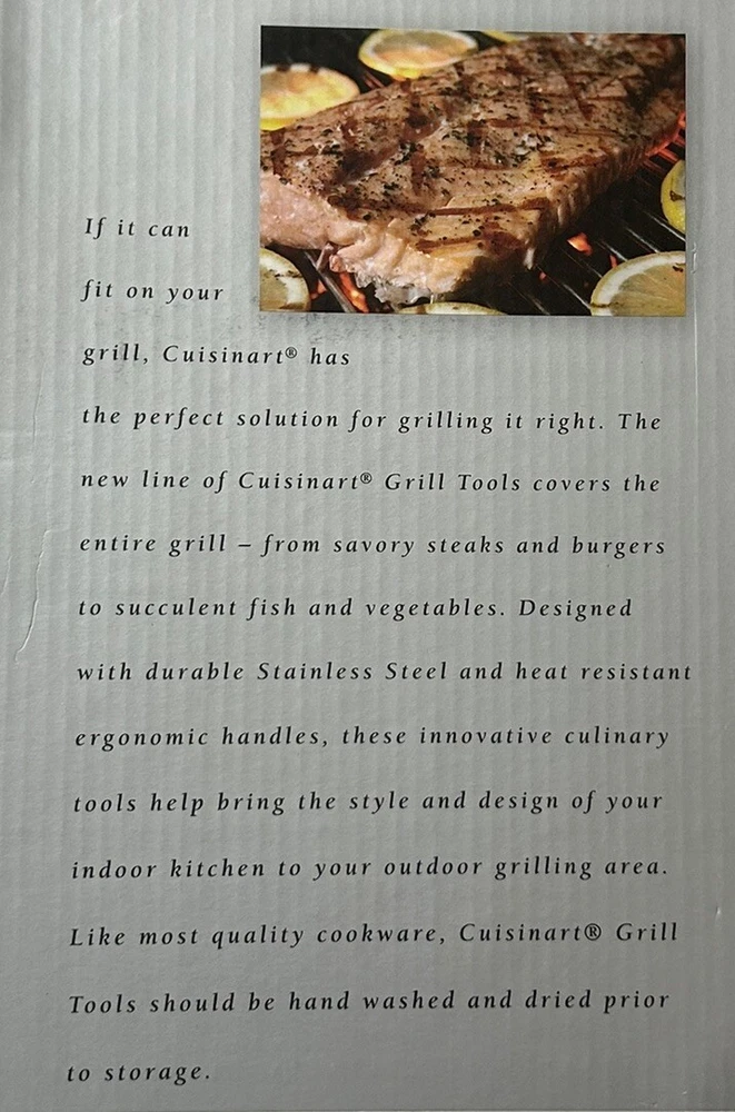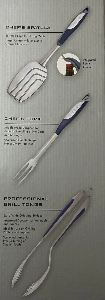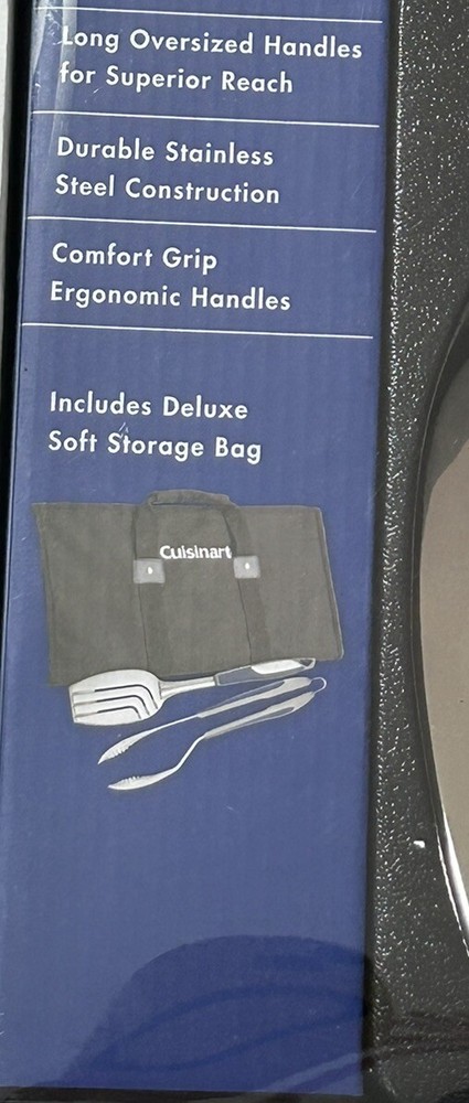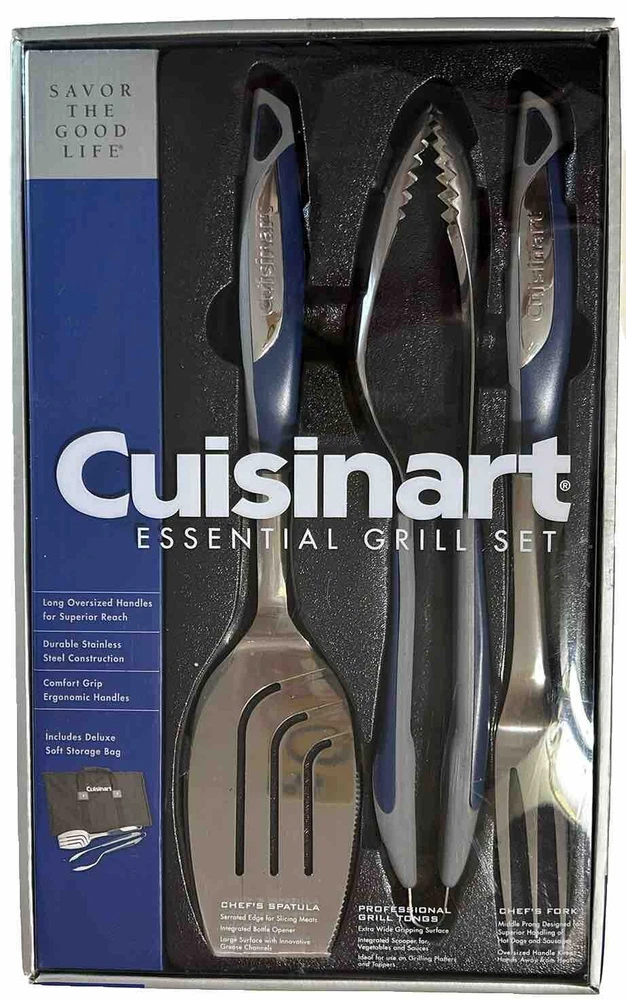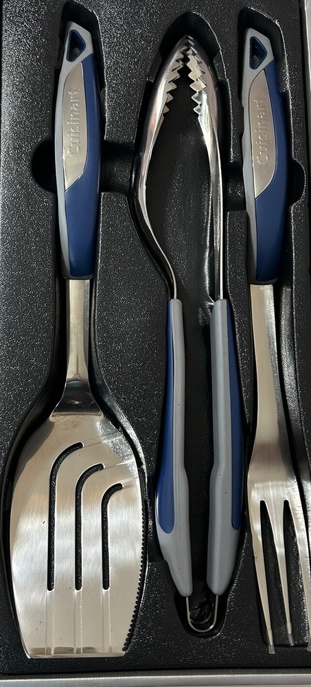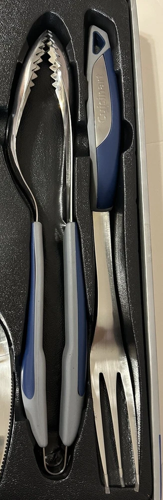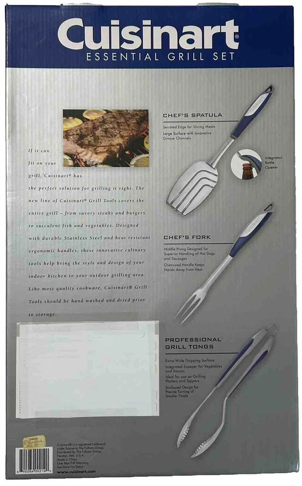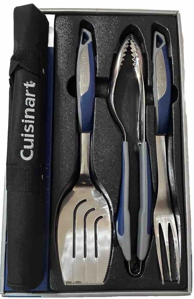 Type: BBQ Tool Set Set Includes: Barbecue Fork, Spatula, Tongs, Storage Bag Personalization Instructions: NA Style: Contemporary Manufacturer Warranty: NA Handle Material: Ergonomic Heat Resistant Features: Easy Clean, Reusable, Ergonomic, Professional Chef Color: Blue MPN: CGS-134 Number in Pack: 4 Country/Region of Manufacture: China Finish: Silver Number of Items in Set: Four-Piece Item Weight: 4 lb Item Height: 21 in Size: Large Model: Cuisinart CGS-134 Item Width: 13 in Year Manufactured: 2009 Personalize: No Head Material: Stainless Steel Brand: Cuisinart