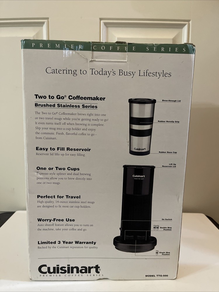 Cuisinart TTG-500 Two To Go Coffeemaker w/ Two 14oz Mugs - New Open Box Item is brand new, open box. Please SEE PHOTOS for item condition and further item details.